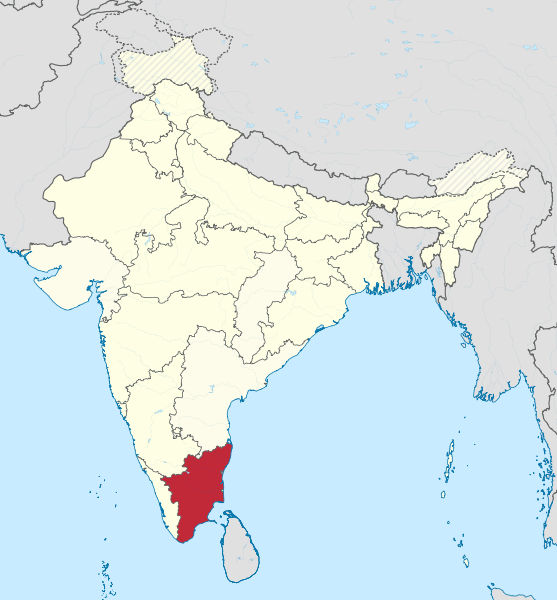 Местоположение штата Тамилна́д (Тами́л-На́ду) на карте Индостана
