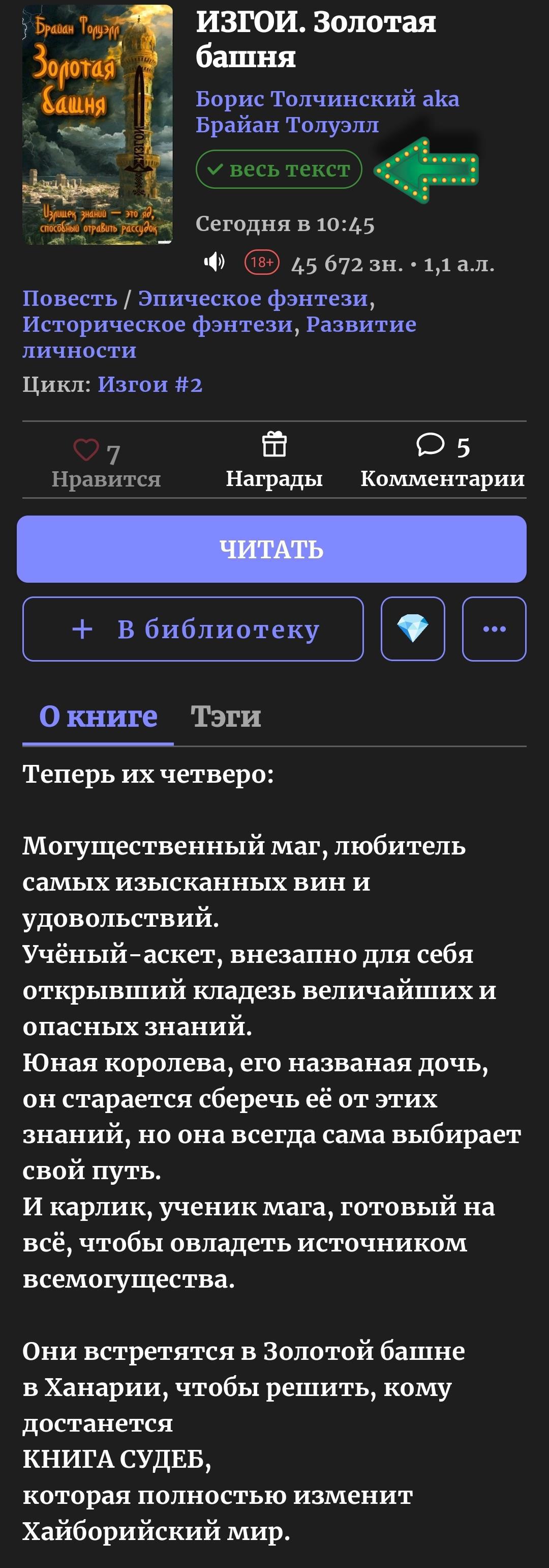 Автор: Борис Толчинский aka Брайан ТолуэллВот и всё! Никаких ознакомительных фрагментов. "Золотая башня" закончена и выложена в свободный доступ. Это полностью самостоятельная вещь в рамках цикла "Изгои", читать её лучше сразу после "Стигийской мглы", как прямое продолжение описанных там событий.
