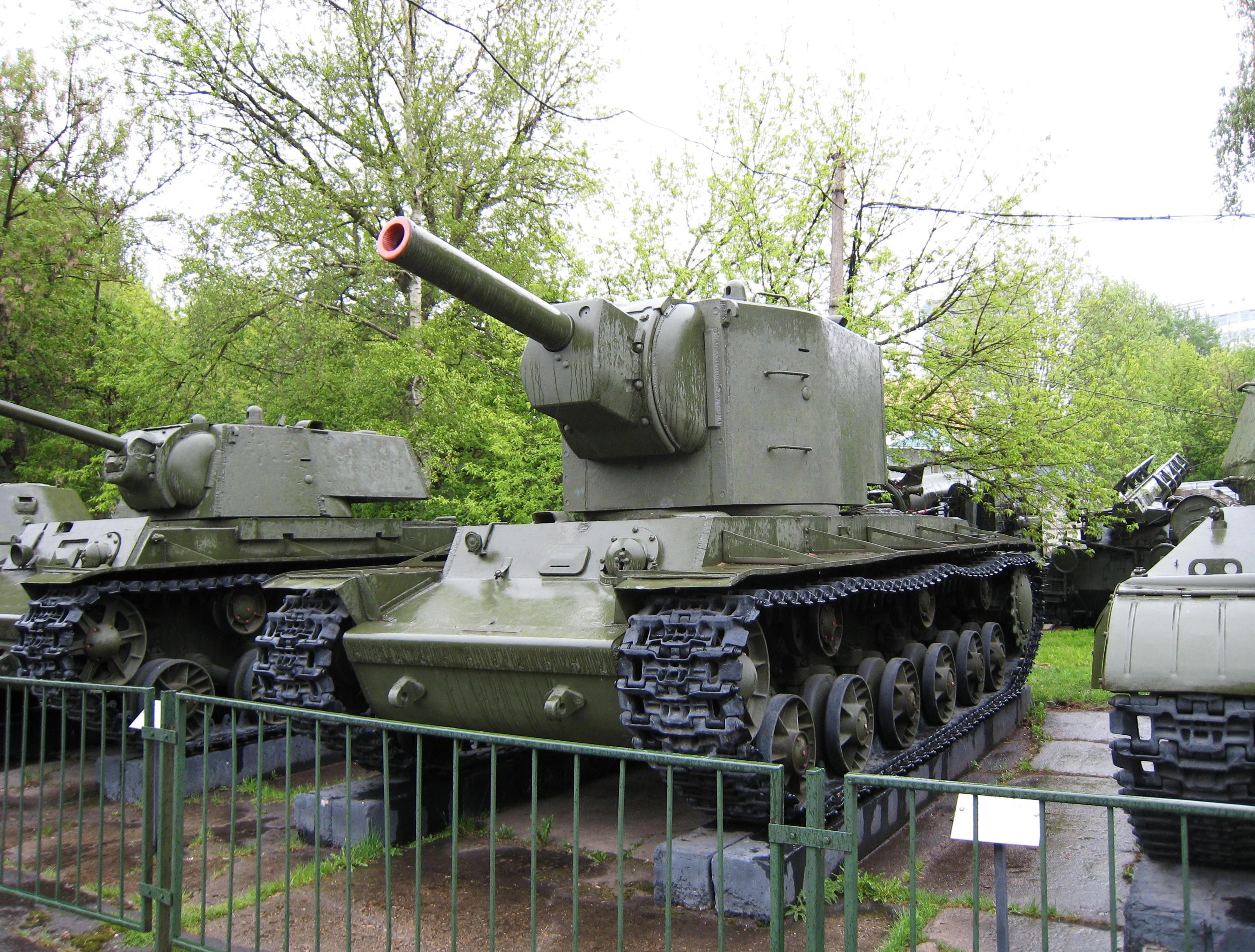 Тяжелый танк КВ-2 с 152-мм гаубицей. Левее виднеется КВ-1, у него в башне 76-мм пушка. КВ-2 предположительно 1940 года. Броня до 75 мм. Одна гаубица и 3 пулемета. Максимальная скорость 34 км/ч. Экипаж 6 человек.