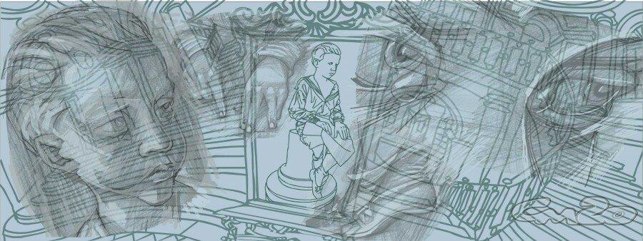 Мальчик посмотрел на свои ноги в туфлях со спущенными носками,которые ему никогда не подтянуть,окинул взглядом в трюмо всю свою фигурку,высеченную вместе с колонной,на которой он сидел,из одной глыбы мрамора,и горько вздохнул,как старый особняк.
