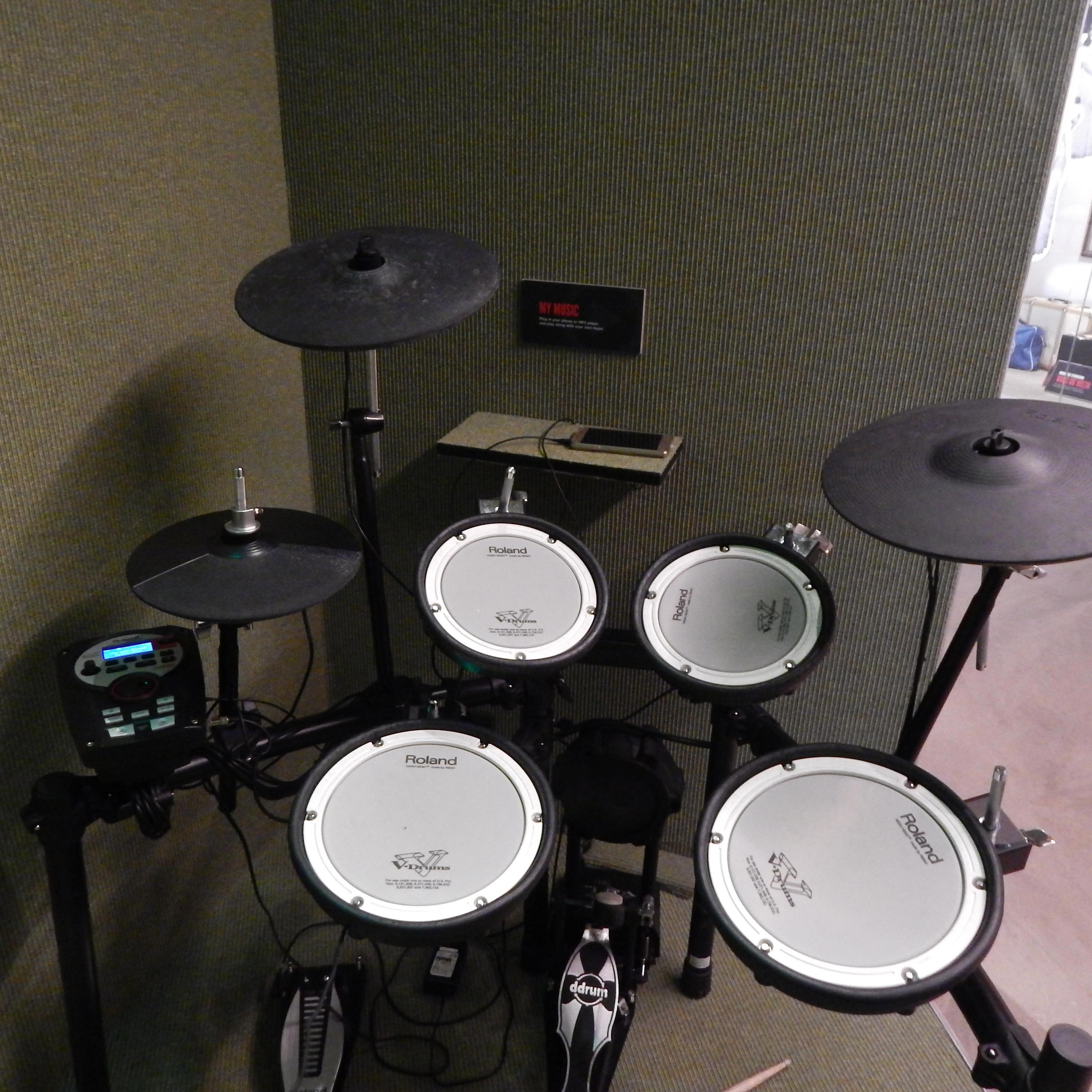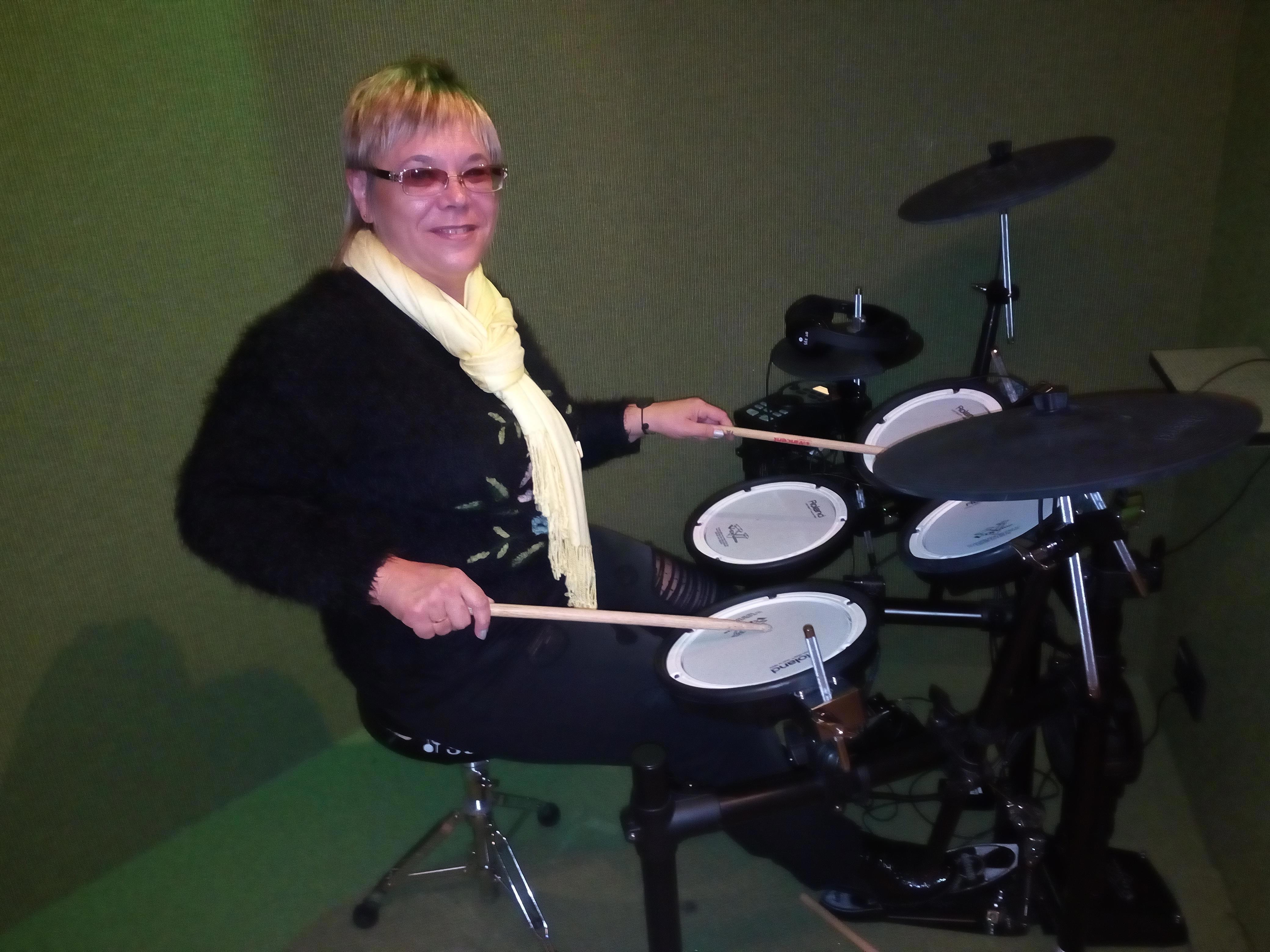 Да, там можно "примерить" электрогитару (тяжёлая, однако) и "постучать" на ударной установке под выбранную песню.