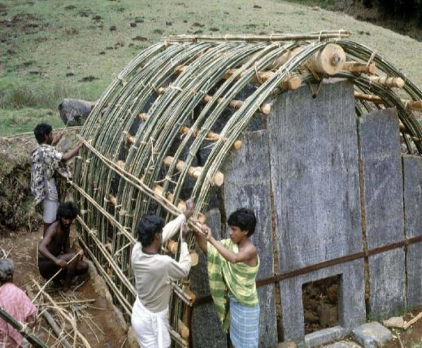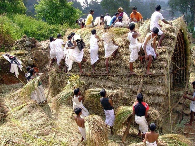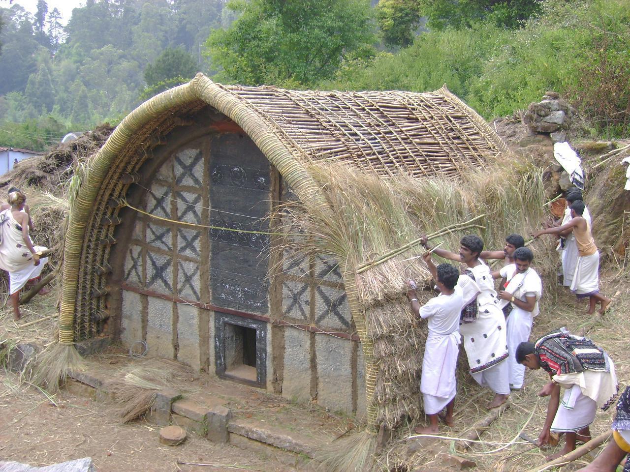Типичная архитектура строений протоиндицев племени «Тода».Деревня Тодов — несколько бочкообразных хижин, сделанных из бамбука и тростника, без окон, с одним маленьким входом.