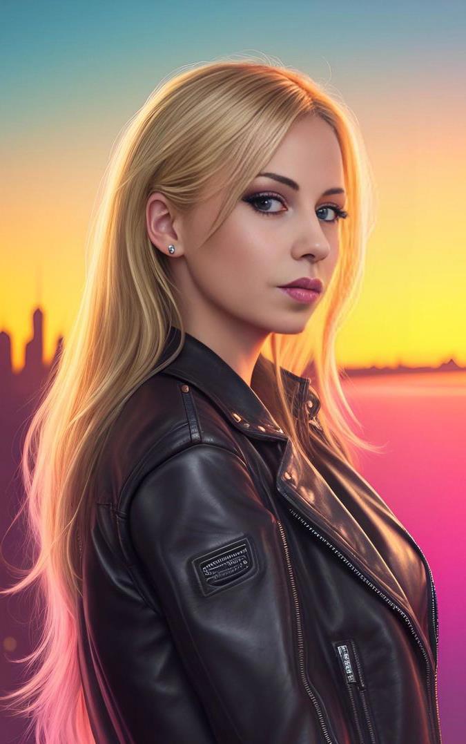 Город, кожаная курточка, косуха, розовый закат. Задавалось еще джинсы, но ИИ решил, что ноги мне ни к чему, пусть будет портрет.
