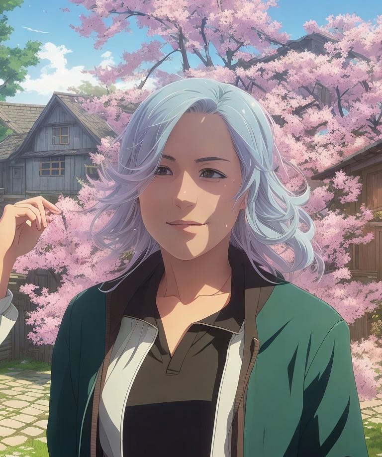 Японские мотивы получились вот такими - сакура, деревенька, чья-то рука в кадре, футболочка и спортивная куртка. (Должна была быть черная водолазка и черная куртка. Зелеными должны быть глаза, но стала курточка).