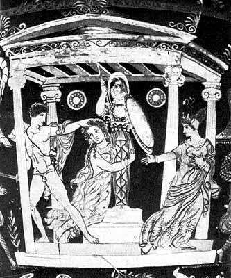 Царевну, конечно, не побили, но Приам, было дело, засунул её в тюрячку за слишком откровенные речи. Согласно некоторым версиям, именно Кассандра предрекла при рождении Париса, что он погубит Трою, но это вряд ли возможно: Кассандра и Елен моложе Париса.
