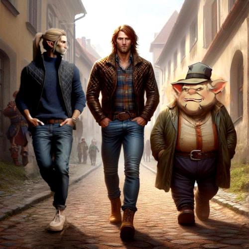 Вначале у меня тут навстречу приключениям бодро марширует троица главных героев: ИИ внезапно выдал на редкость годного Рохлю, с одной стороны у него Альбин Мята из вчерашних эльфов, с другой - маковка-тролль.