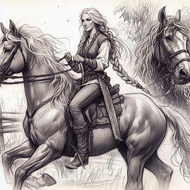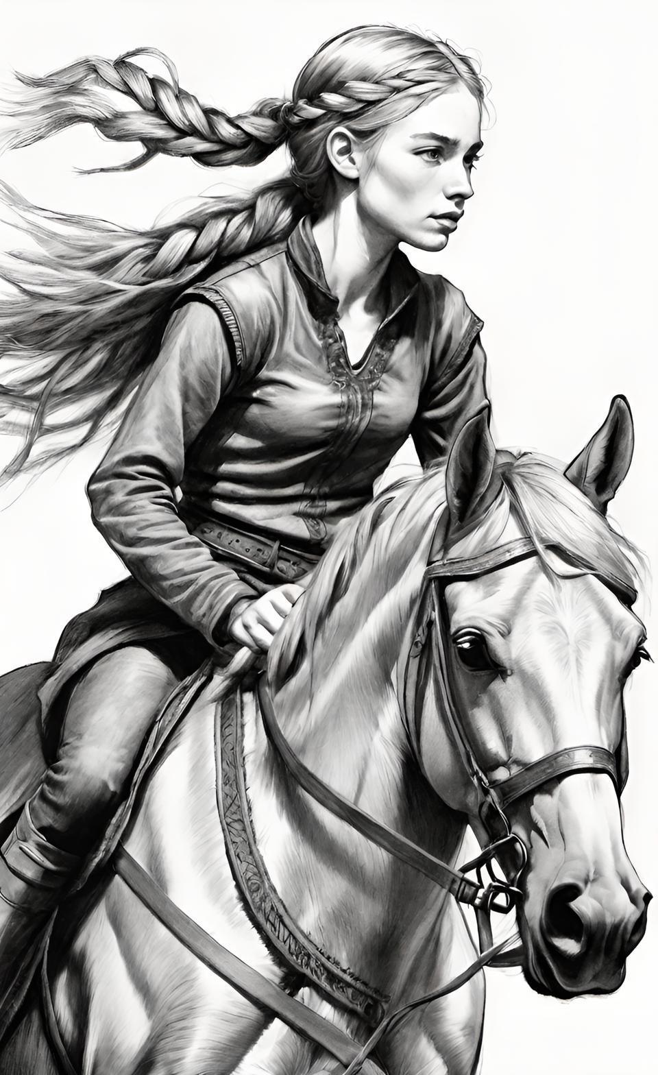 Алетейя верхом на коне... ну, там было много всякого, в основном вырвиглаз. Недовольна обеими. Эта неправильно одета (половецкая княжна, вы серьезно?) и не очень походит на девушку с первых четырех рисунков, где она с братом. Бинг.