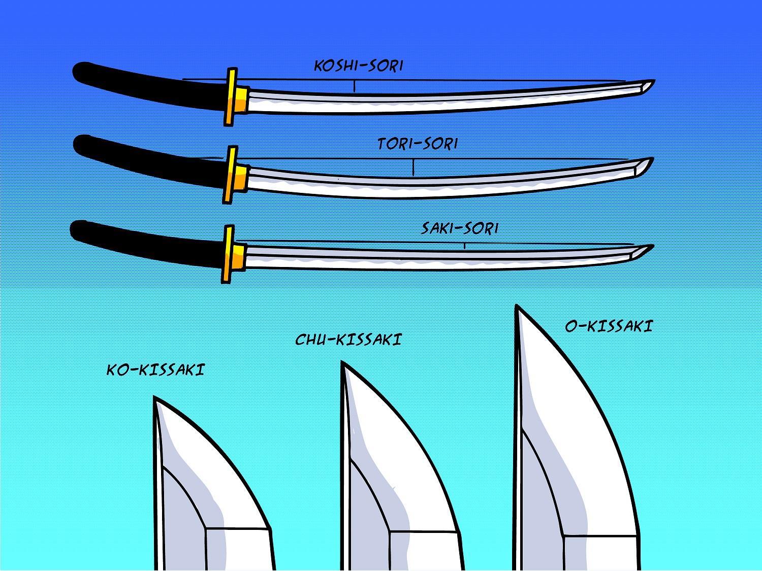 Собственно катаны также отличаются друг от друга прогибом клинка и строением острия