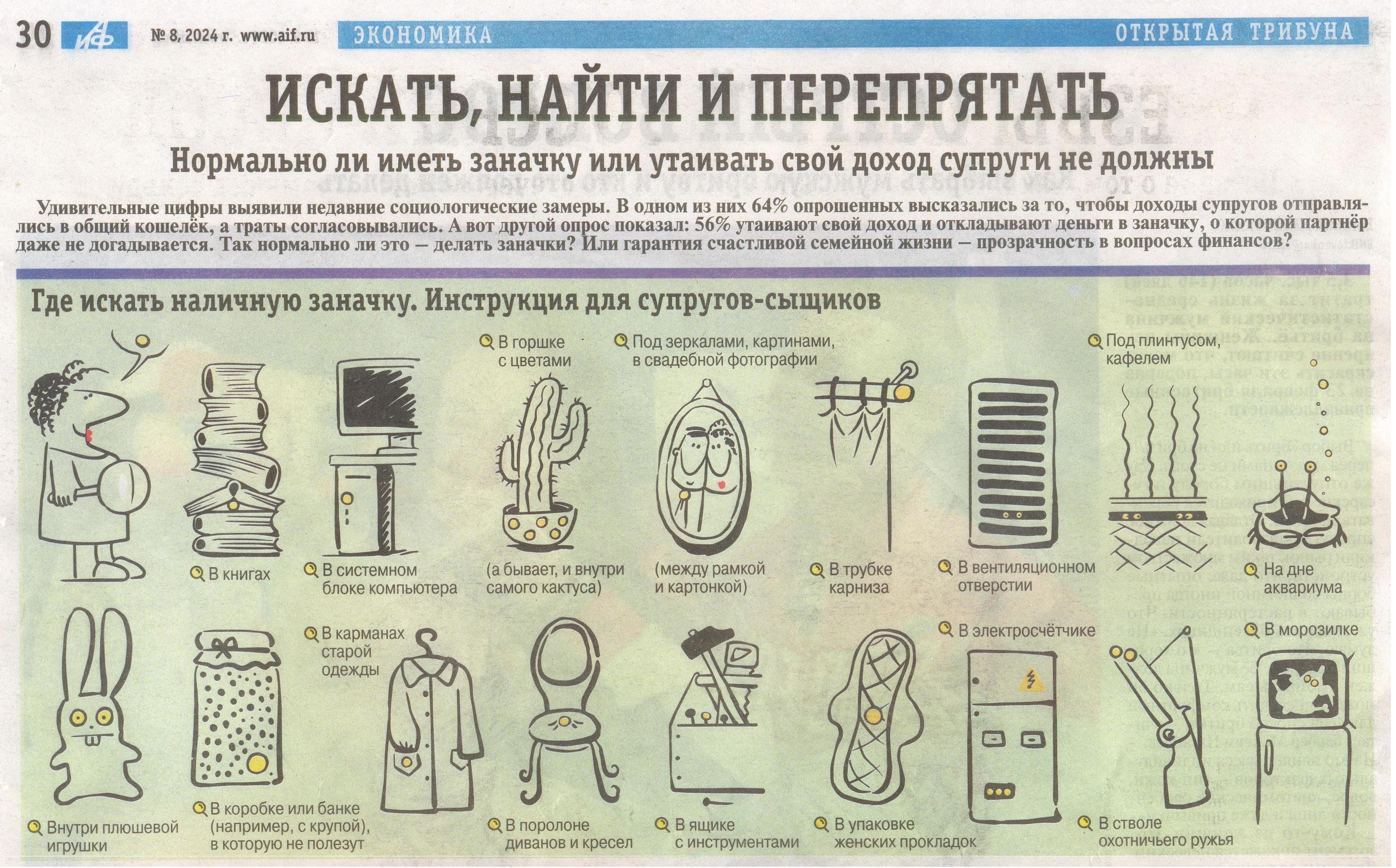 Как интересно, оказывается, мужья от жён деньги прячут! Настоящая тоталитарная страшилка, в духе романа Евгения Замятина «Мы» и рассказов про Северную Корею, (в Северной Корее не так страшно). А заодно – «закрытый» детектив и игра «найди кота» в лучших традициях жанра. Оказывается, деньги можно прятать: в вентиляционном отверстии, под выпадающей паркетиной, под плинтусом, в пакете или банке с крупой, в ружейном стволе, в горшке с кактусом, и даже в самом кактусе, выдолбленном изнутри. Бедный кактус! Как он вообще жив остался после подобной операции. Над всем этим можно от души посмеяться, но...