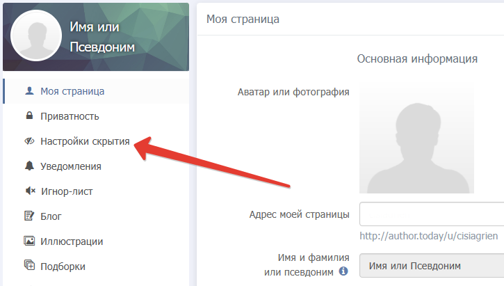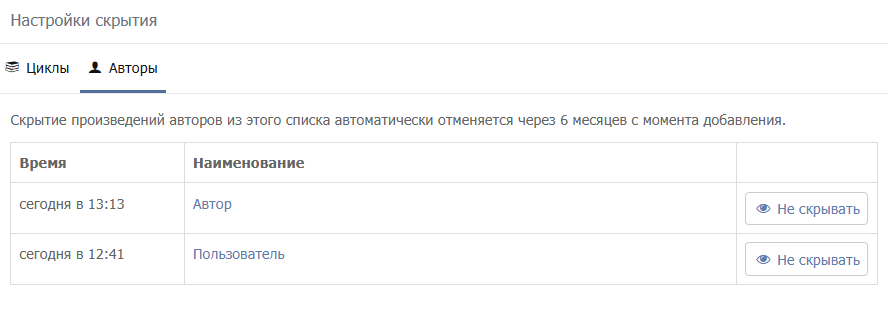 Скрытые авторы и циклы отображаются в разделе Настройки скрытия в личном кабинете пользователя.