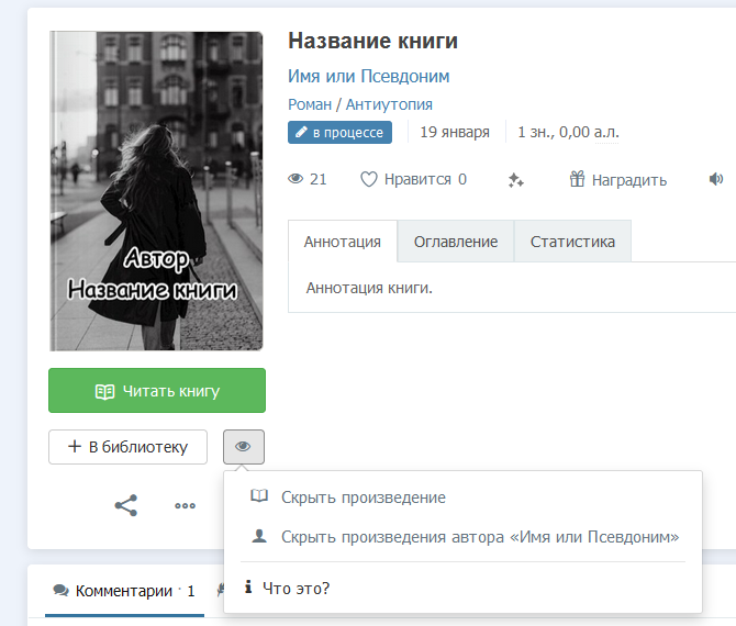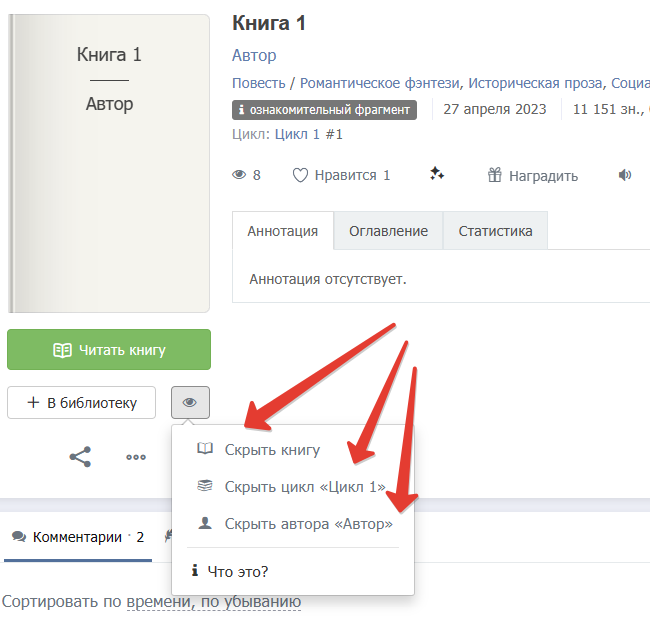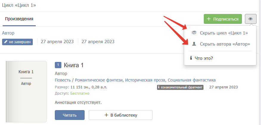 Для вашего удобства при нажатии на значок глаза (на странице автора, на странице книги и цикла) есть подсказка, как работает скрытие.