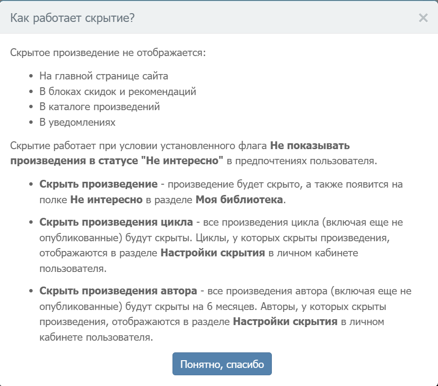 Важно! Автор скрывается ровно на 6 месяцев, после чего автоматически вернется в поисковую выдачу и на главную страницу сайта. Я хочу еще раз напомнить, что скрытие автора и добавление его в игнор-лист - разные вещи. Внесение автора в игнор-лист никак не влияет на отображение его произведений на сайте и никак не ограничивает уведомления от него. Если вы не хотите видеть чьи-то книги, воспользуйтесь функционалом скрытия. Через 6 месяцев можно повторить :)