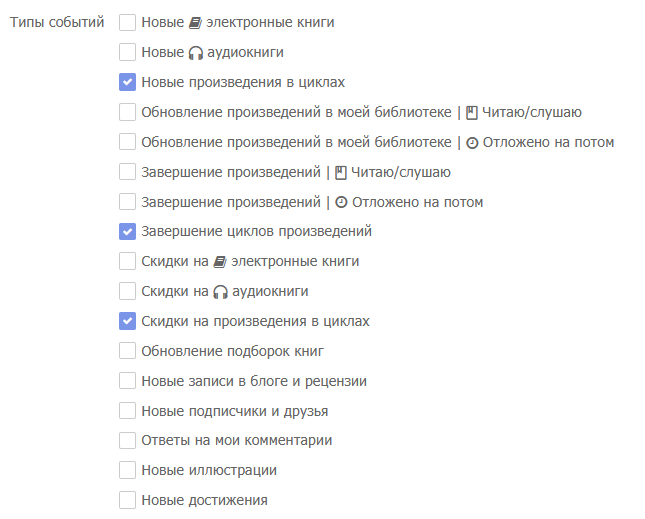 - Настройки "Новые произведения в циклах" и "Скидки на произведения в циклах" работают только при условии, что установлены соответствующие галочки для электронных книг/аудиокниг.