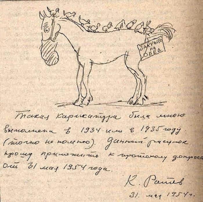 Ответ: В 1934 году, не помню в каком месяце, Ротов принес в редакцию «Крокодила» карикатуру, изображавшую дискредитацию советской торговли и советской кооперации. Эту карикатуру видел ряд сотрудников редакции, большинство которых возмущались ей. Других конкретных фактов, относящихся к 1934 году и началу 1935 года, я сейчас припомнить не могу…»