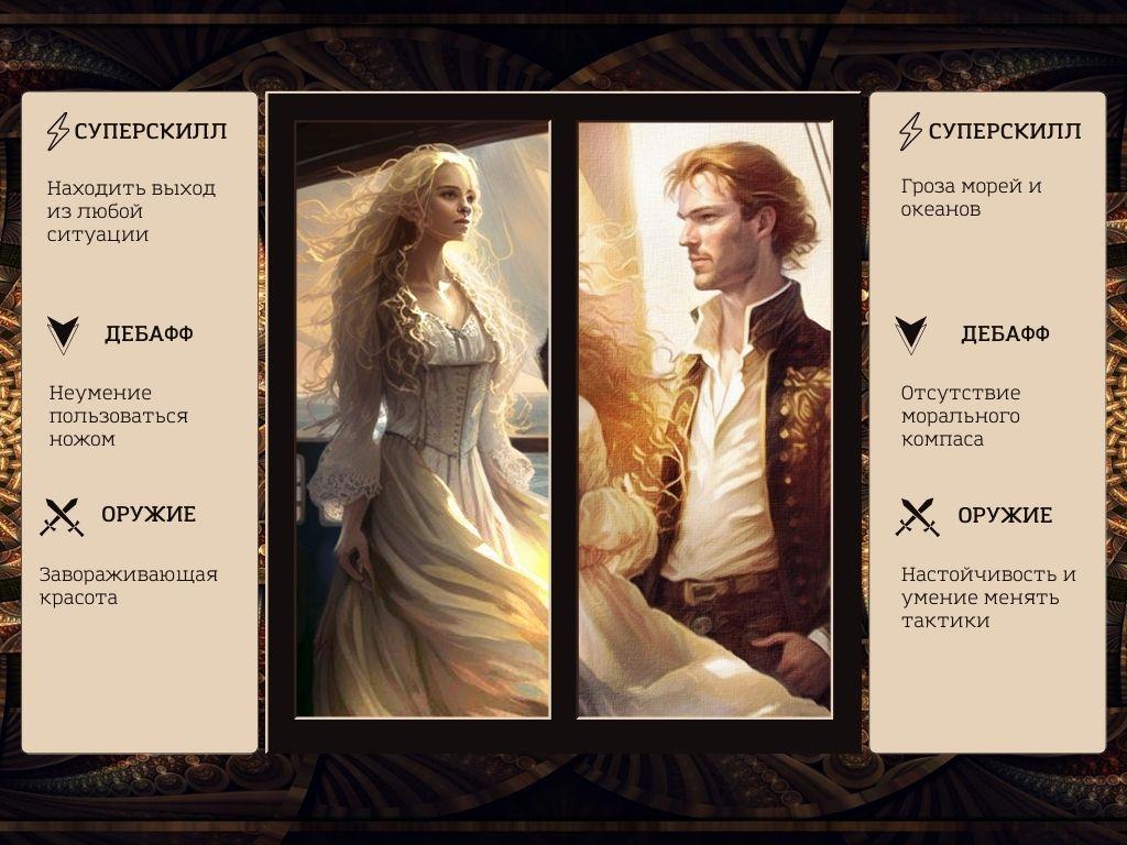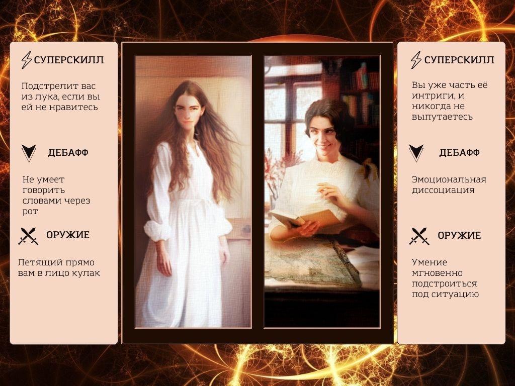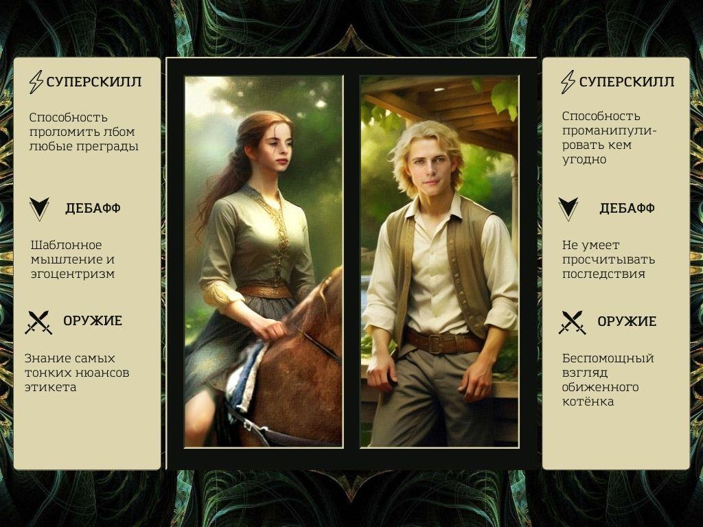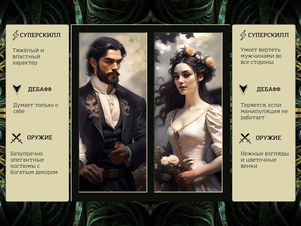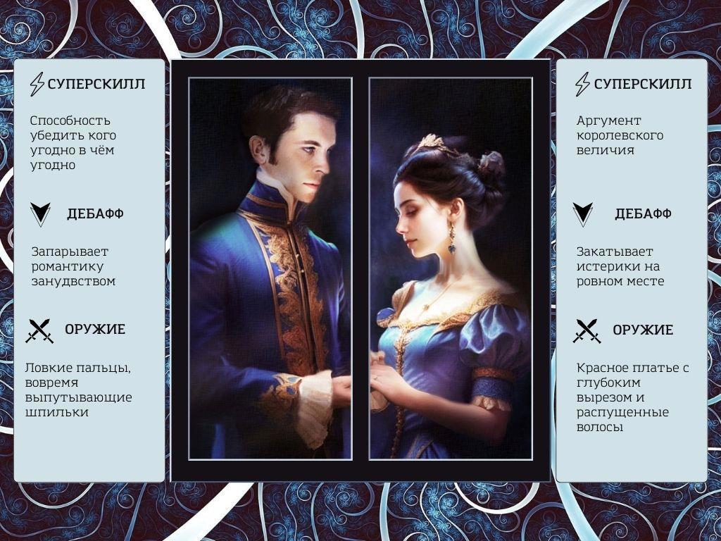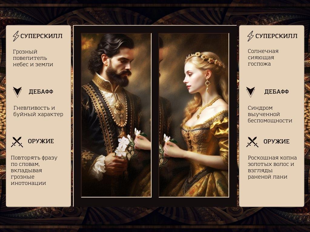 У нас имеет место: самодержавная королева, которую с детства растили как наследницу престола. Глубокий интеллект, властность, привычка управлять и командовать. По логике вещей, такая женщина должна была в браке полностью подавить партнера - поэтому я долго мудрила с характером ее супруга, но подобрала, наконец, такой, чтобы был ей под стать. Упорный, целеустремленный, сильный мужчина типажа "сделал себя сам", с мощно прокаченным навыком дипломатии и способностью к манипулированию. В общем, в этом браке искры летят - несмотря на то, что оба характера отличаются сдержанностью, рассудительностью и логичностью. Я в большом восторге от того, что получилось. И да, я помню, что обещала вам цикл рассказов про их семейные ссоры. Один буквально на днях продумала в голове полностью, возможно, в ближайшее время напишу.