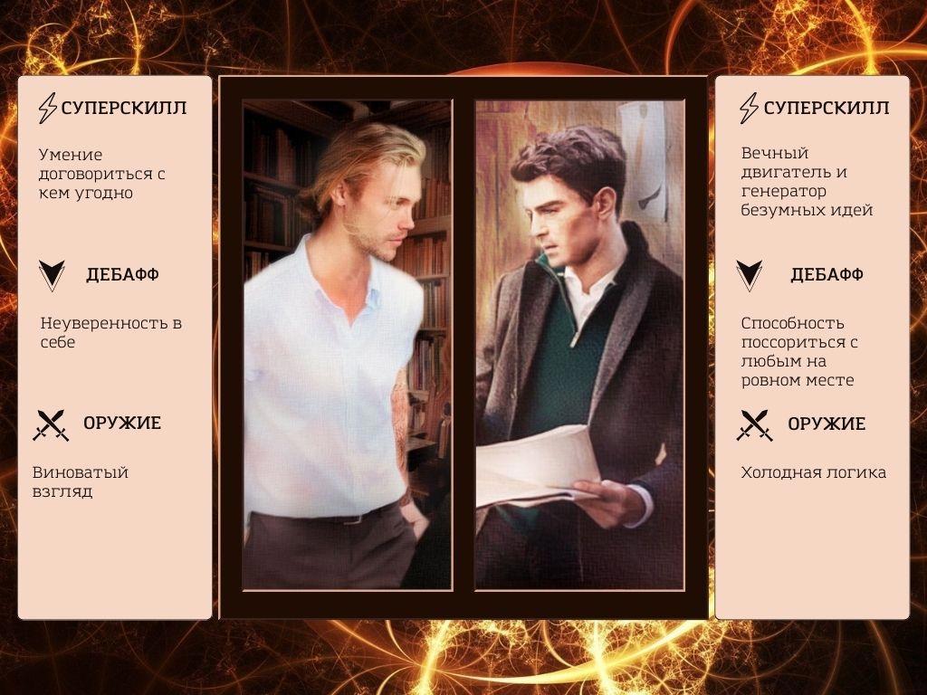 Идем дальше: дружеское противостояние. Сдружить противоположности - что может быть интереснее? Обаятельный любимец толпы - и надменный одиночка, ставящий себя над толпой и потому вызывающий ее неприязнь. Легкий взбалмошный характер - и привычка все продумывать и просчитывать наперед. Застенчивость и робость - и самоуверенность и гордость. Мягкая вера в Бога и любовь - убежденный атеизм и эгоцентризм. В них так много разного - но при этом общие жизненные принципы, взгляды на жизнь и убеждения! Такой тандем обречен на успех, потому что они прекрасно дополняют друг друга и страхуют друг друга, восполняя то, чего недостает второму.