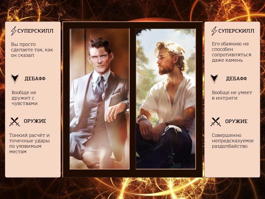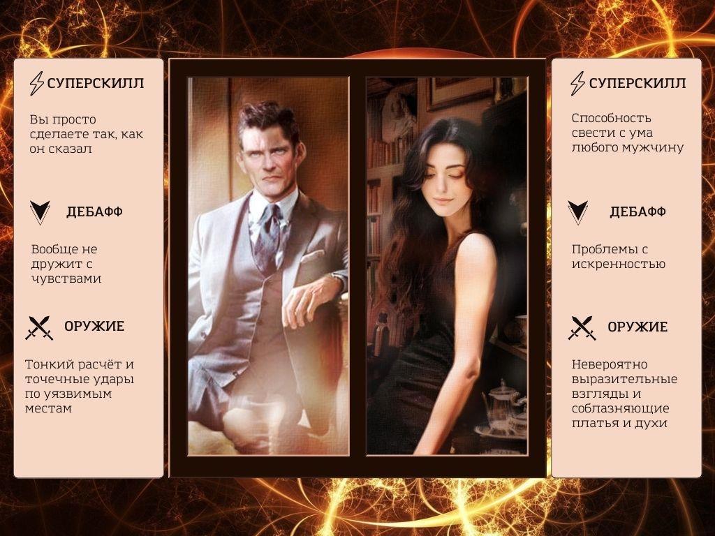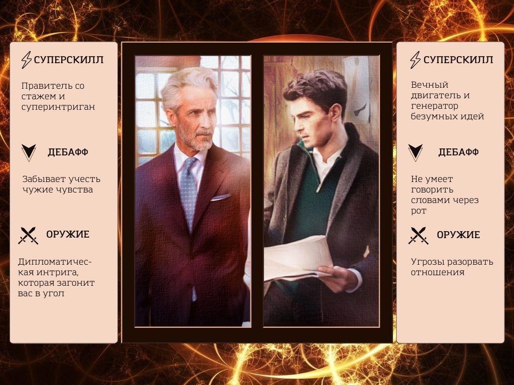 Итак, политик из прошлого описания - и предыдущий любовник его дамы! О, здесь сошлись интрига и прямодушие, логика и эмоции, лицемерие и честность, властность и раздолбайство! Второй персонаж вынужден сотрудничать с политиком из-за угрозы шантажа, но ищет способов вырваться из этого влияния. Каждая сцена между ними полна напряжением!