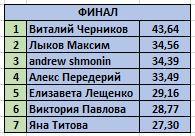 ![]() | На второй этап, в финал конкурса вышли семь участников. Изначально их предполагалось только шесть, но жизнь внесла свои коррективы, и на некоторых ступеньках участники стояли вдвоём... Виктория Павлова Лыков Максим andrew shmonin Алекс Передерий Елизавета Лещенко Яна Титова Виталий Черников Все наши финалисты будут отмечены дополнительным знаком! |