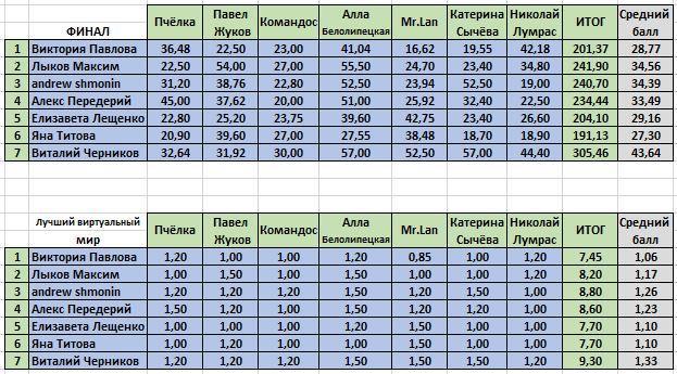 Итоги конкурса теперь можно увидеть в таблицах, размещенных ниже, под спойлером, или на стартовой странице второго этапа (финала).
