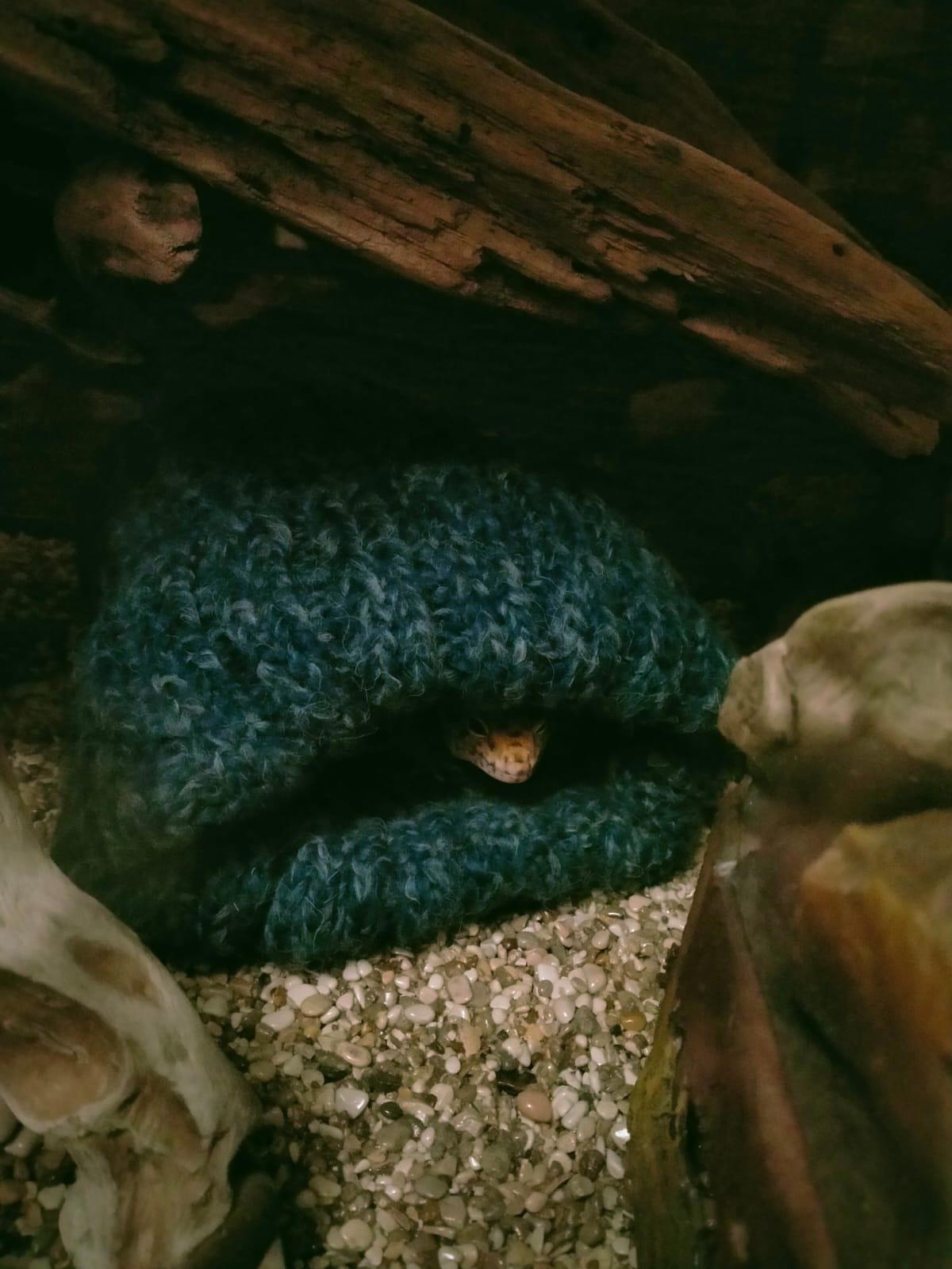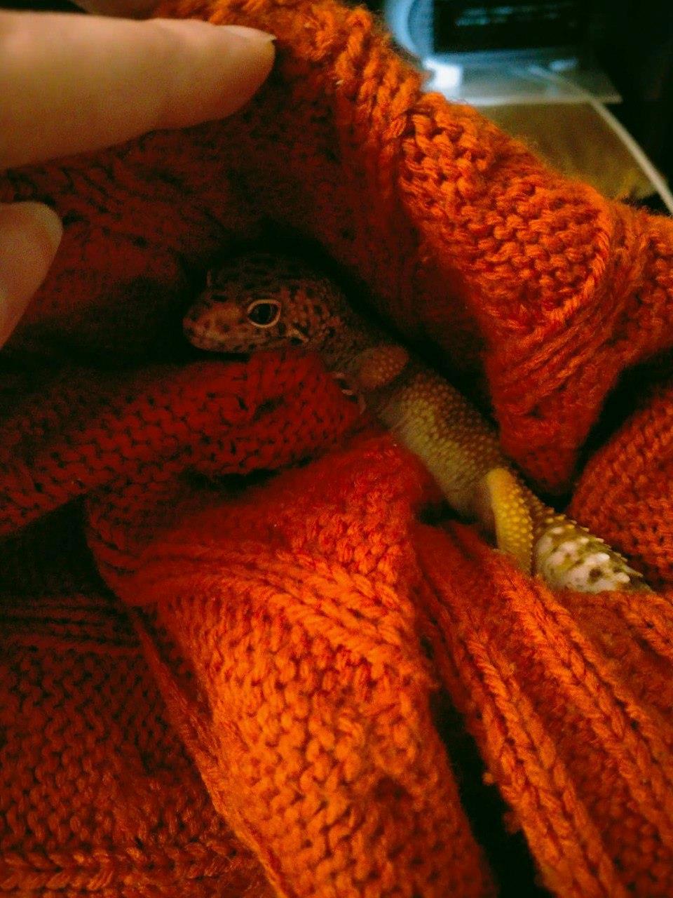 Однажды у меня дома было что-то совсем холодно, я надела свитер, и Пятнышку показалось отличной идеей залезть ко мне в рукав. Я соорудила ему гнездо из нагретого свитера и ему такое убежище пришлось очень по душе!