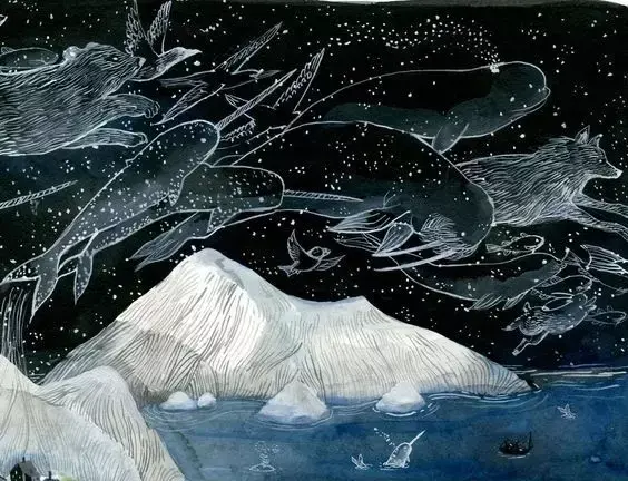 Я летела над морем и видела, как в его глубине проплывали киты. Когда они поднимались к поверхности воды, небо пронзали струи воды, что вырывались из их дыхал. По этим струям в глубину морского тела проникал звёздный свет.