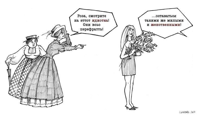 Подружки рассорились вдрызг. И в самом деле, как можно сравнивать: одно дело, когда я выхожу замуж за молодого художника, это хорошо и правильно и вообще победа женского движения — и совсем другое, когда какая-то увядающая вертихвостка в погоне за уходящей молодостью дурит голову моему мальчику!