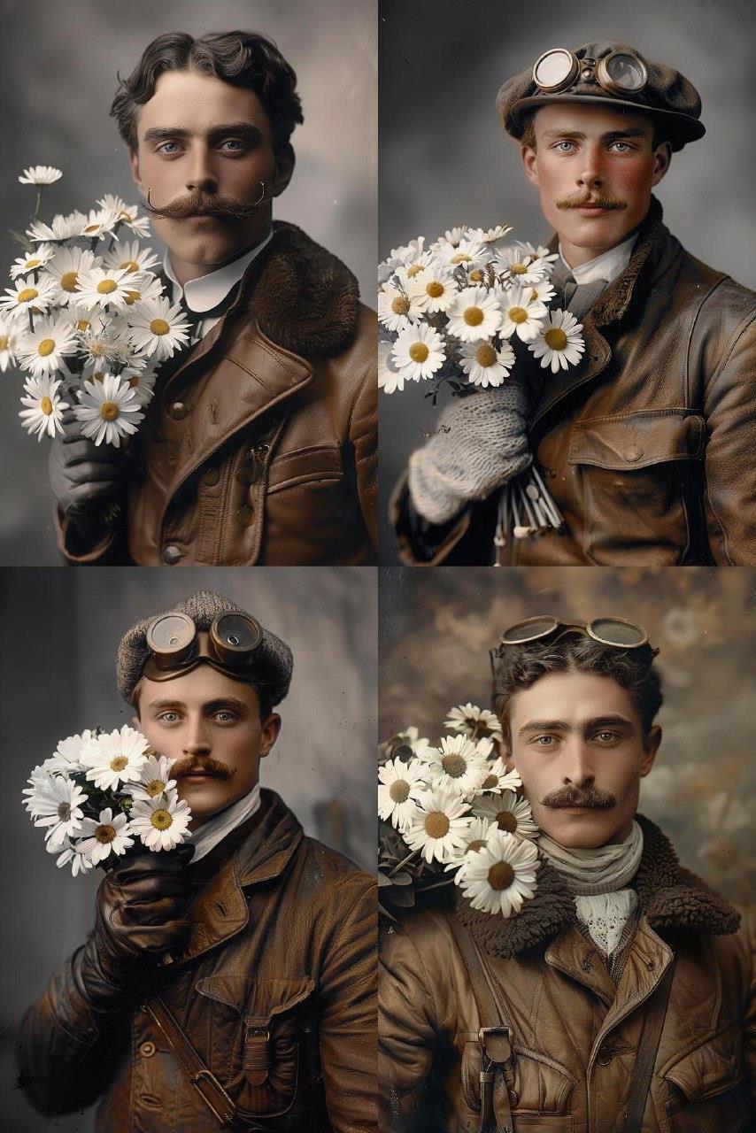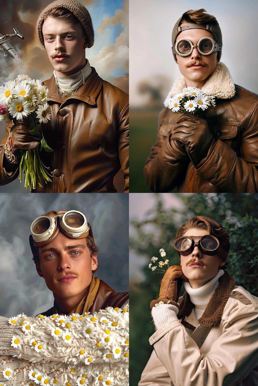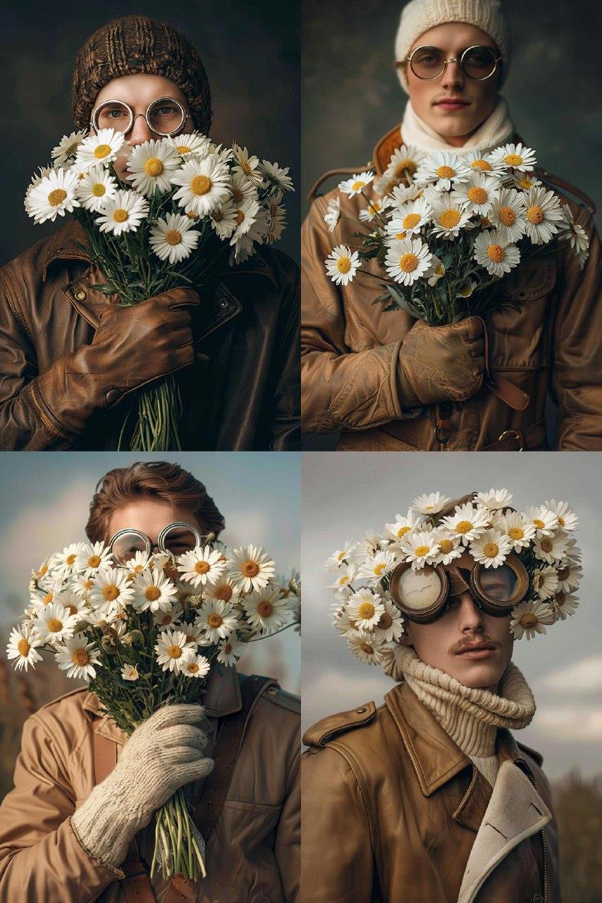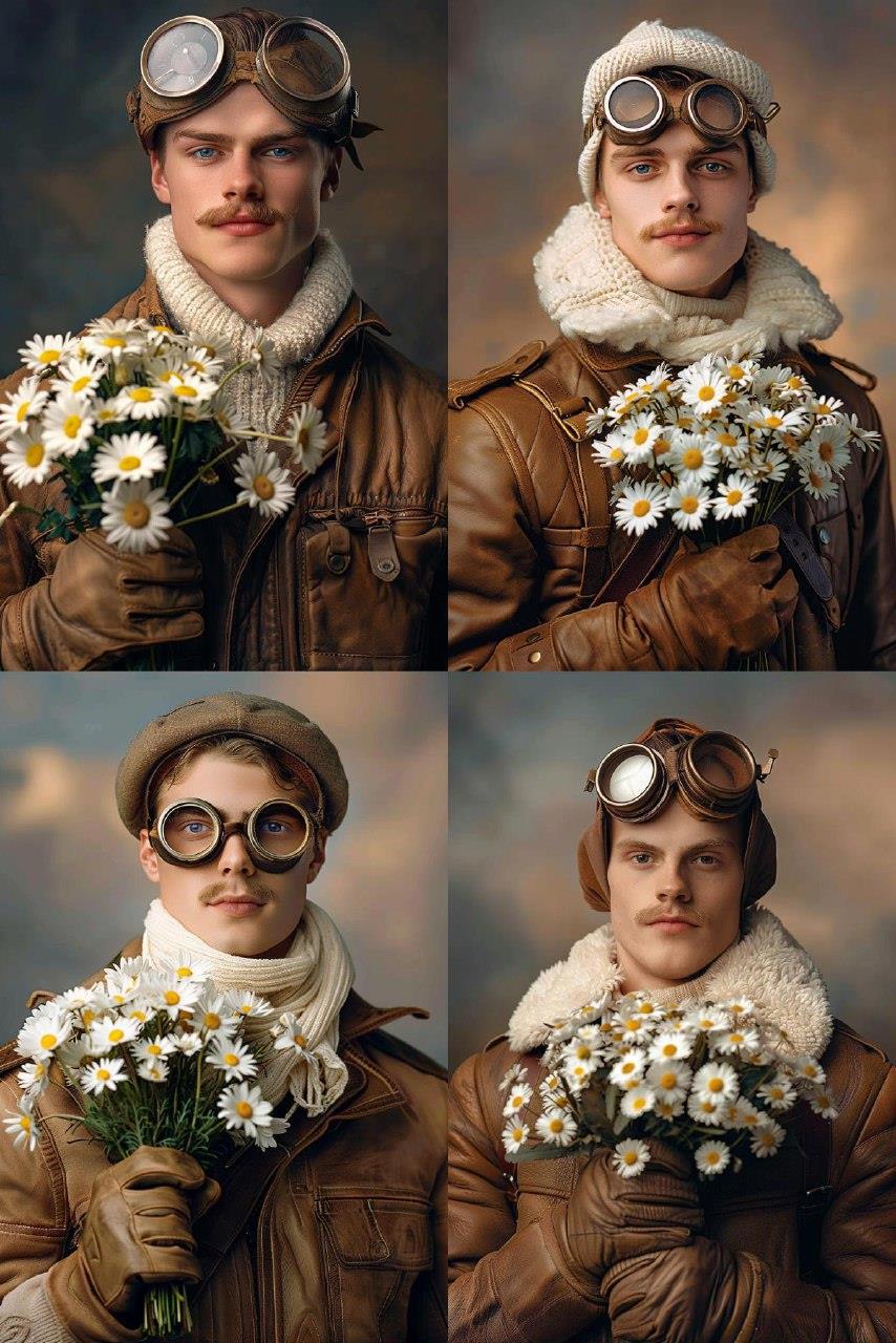 Автор: Сергей МельниковХотя ладно, проржитесь. К посту приложены варианты, через которые я пришёл к вчерашней поздравительной открытке с Сабуровым. Не спрашивайте, почему нейросеть именно так видит бравого авиатора с букетом ромашек. Листайте, там много