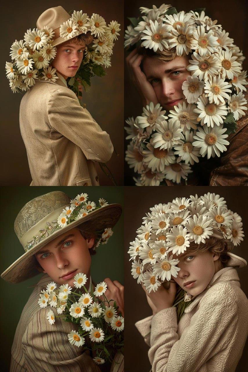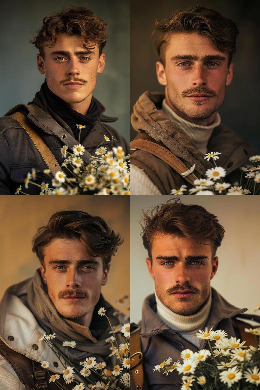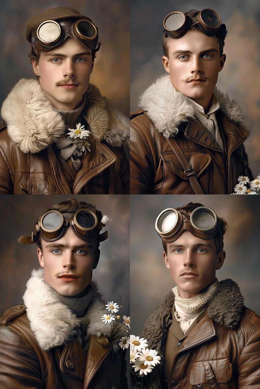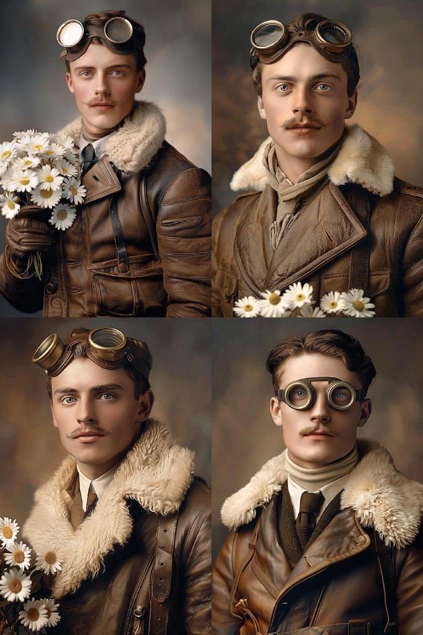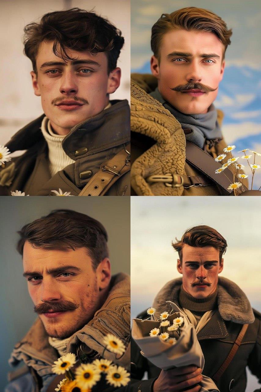 Автор: Сергей МельниковХотя ладно, проржитесь. К посту приложены варианты, через которые я пришёл к вчерашней поздравительной открытке с Сабуровым. Не спрашивайте, почему нейросеть именно так видит бравого авиатора с букетом ромашек. Листайте, там много