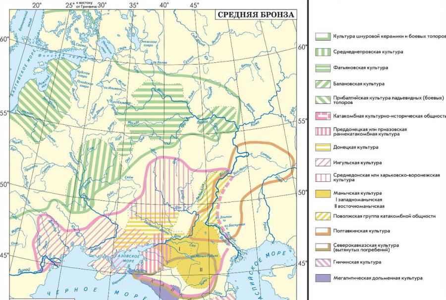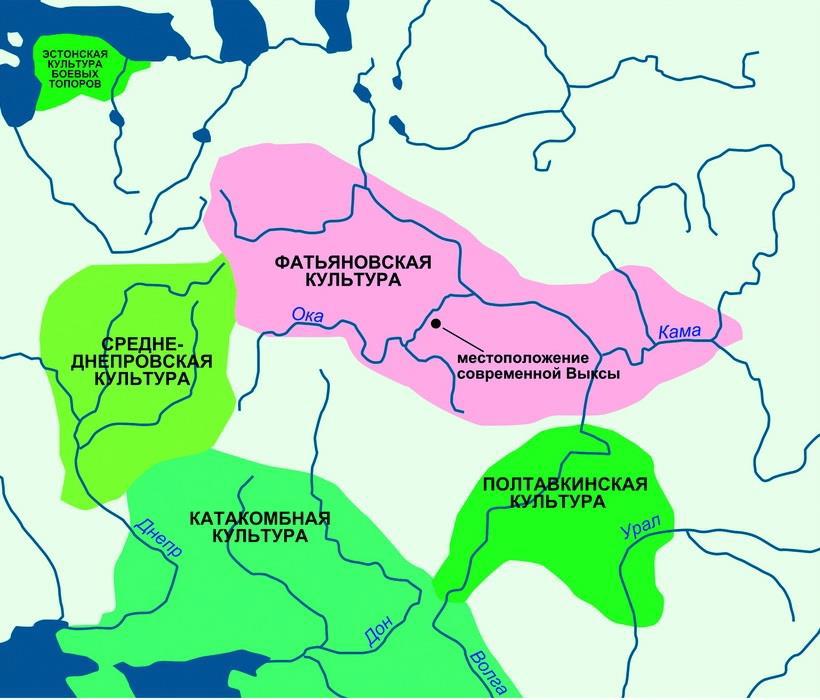 Фатьяновская культура (розовый цвет). В составе культуры боевых топоров. Локализация — Верхняя и Средняя Волга. Датировка — III тыс. до н. э. Носители — индоевропейцы. Тип хозяйства — оседлое скотоводство. Исследователи — А. С. Уваров, Д. А. Крайнов.