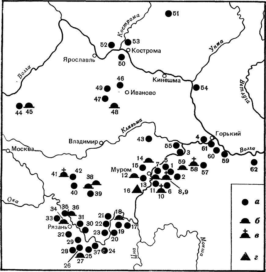 Локализация: Ивановская, Владимирская, Нижегородская, Московская, Тверская, Смоленская, Калужская, Костромская, Пензенская (Озименки), Рязанская, Тульская, Орловская, Ярославская (Фатьяново, Волосово-Даниловский могильник) и Новгородская области, Чувашия (Баланово), Татарстан, Мордовия (Ош-Пандо), Москва (Боровицкий холм, парк «Зарядье», Воробьёвы горы, Царицынский парк, Давыдково).