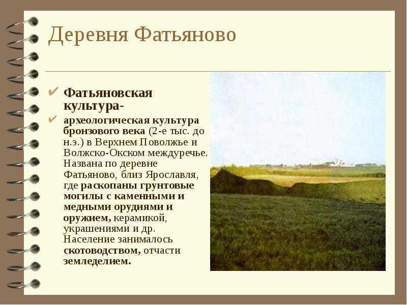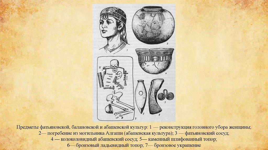 1. Фатья́новская культу́ра (от 2750 до 1900 лет до н. э., по другим данным — 1800 — 1000 гг. до нашей эры)