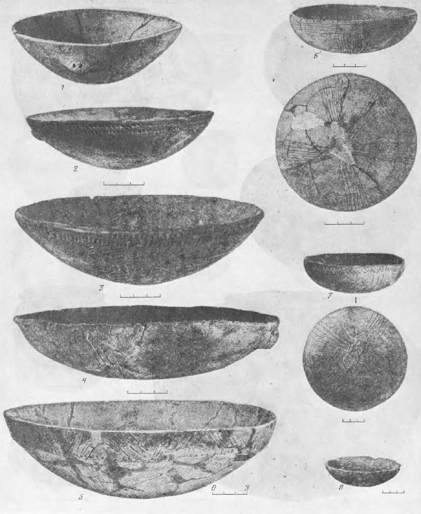 Глиняные сосуды шаровидные, круглые с маленьким донышком с штампованным и нарезным узором в виде солярных знаков, ёлочек и зигзагов.