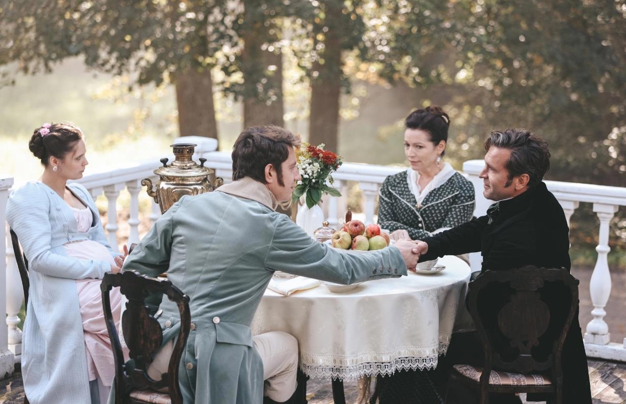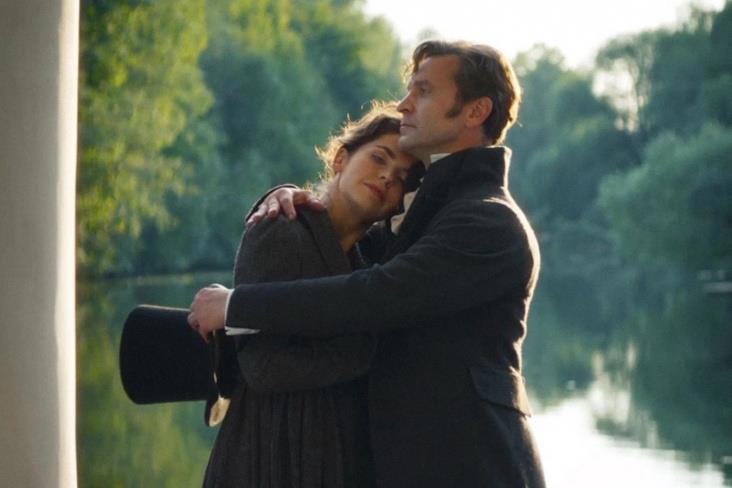4. Изменение визуального возраста персонажей. Самый зыбкий и неочевидный ход, который сперва я восприняла скептически. Ленскому визуально лет тридцать, Онегин даже старше, да и Татьяне дашь около двадцати пяти. В первый момент это вызвало у меня диссонанс - особенно в случае с Ленским (напоминаю, что по роману ему восемнадцать лет). Однако к финалу вопросов у меня не осталось, и я теперь считаю этот ход чрезвычайно удачным. Дело в том, что, какой бы вечной классикой не был "Евгений Онегин", за минувшие двести лет многое в нашей жизни изменилось, и мы стали взрослеть гораздо медленнее. И если во времена Пушкина герои восемнадцати лет воспринимались взрослыми, то мы теперь видим в них чуть ли ни школьников. История восемнадцатилетней девицы, влюбившейся в двадцатипятилетнего повесу, уже не кажется нам драматичной: ну, детский сад! Какая девочка не влюблялась во взрослого парня? Что тут драматичного? Создатели фильма, подобрав более взрослых актеров, сделали историю снова актуальной. Она снова воспринимается нами серьезной, как переживания взрослых людей. Хотя обычно я очень придирчива к расхождению внешности актеров с каноном, в данном случае я считаю изменения оправданным и сильным ходом.