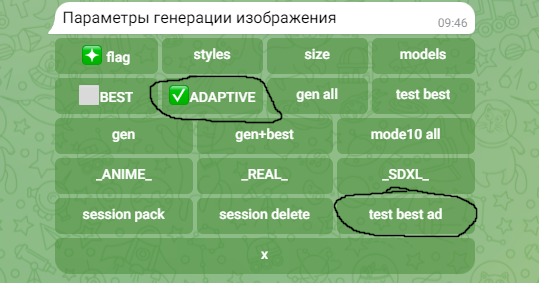Если с чекбоксом всё понятно, то про test best ad чутка поясню. В боте есть метод test best (названия умнее пока не придумал), который проходит по всем моделям и на каждой генерирует два изображения — по введенному запросу и по введенному запросу с улучшательным стилем. Метод test best ad делает в принципе то же самое, но генерирует на каждой модели по четыре изображения — два как test best и два таких же но с использованием сэмплера DMP adaptive. Метод работает медленно за счет долгой генерации, но позволяет наглядно смотреть как происходит генерация на разных запросах с разными параметрами.