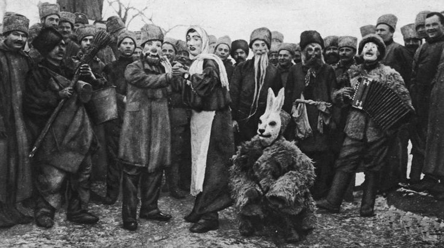 Это русские солдаты. 1915г. Ряженые. Не знаю что они такое празднуют). Может святки?)