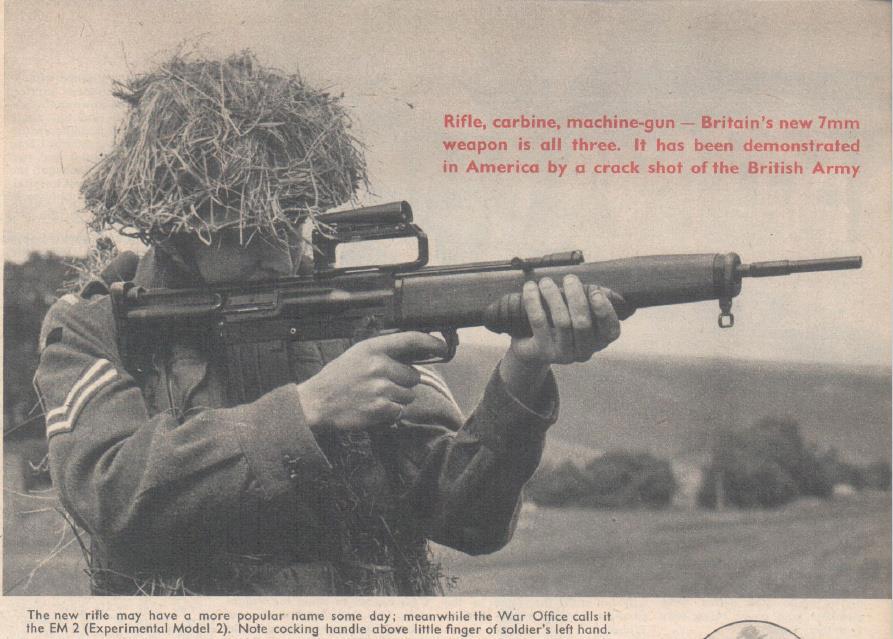 Английскими разработками заинтересовались бельгийцы и канадцы. Причем первые быстро переделали свою будущую FN FAL под новый британский патрон и приняли участие в его дальнейшем совершенствовании, разработав свой вариант с более высокой начальной скоростью. В итоге у английской армии к 1950 году сложилась интересная и удачная система вооружения, в основе которой были два образца: автоматическая винтовка EM-2 (в компоновке буллпап) и единый пулемет с ленточным питанием TADEN.