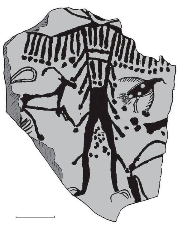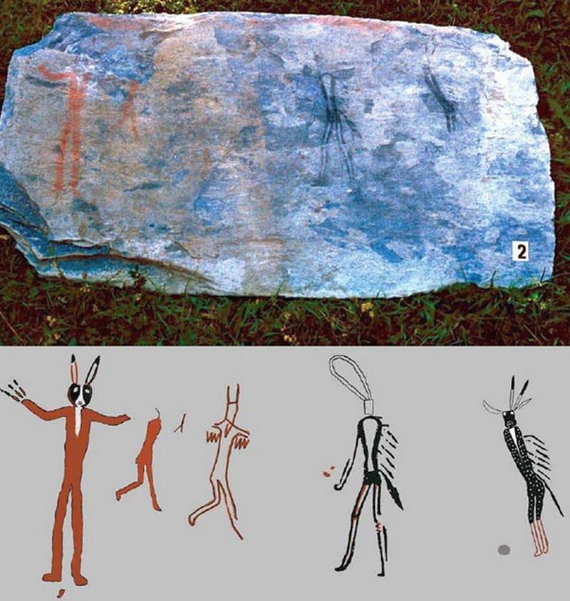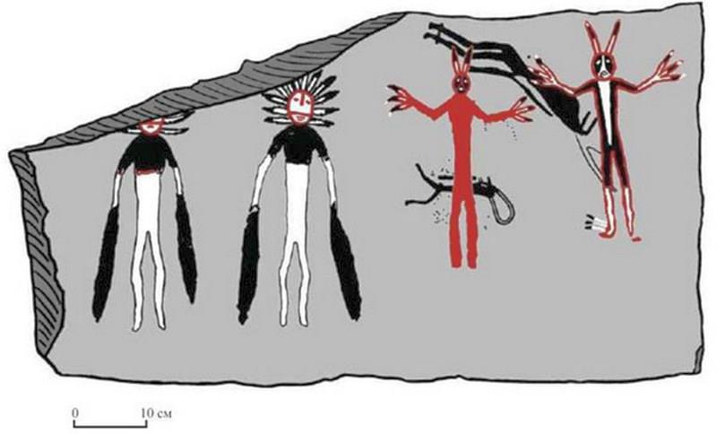 Ещё известно, что тела погребённых были посыпаны красной охрой, но это действие вообще было широко распространено по всей Европе. Одежды на фигурах не видно. То есть скорее всего она была сшита, что называется «в облипочку». То есть это люди в ритуальных костюмах видимо, но тогда они должны изображать конкретных представителей животного мира, но этого ведь не наблюдается – нет в природе хвостатых зайцев в перьях! Так что же это всё значит?