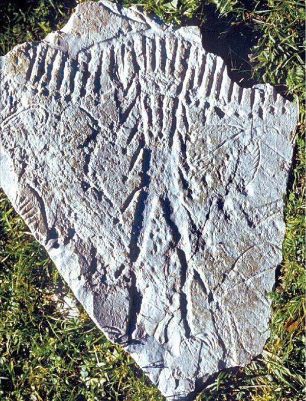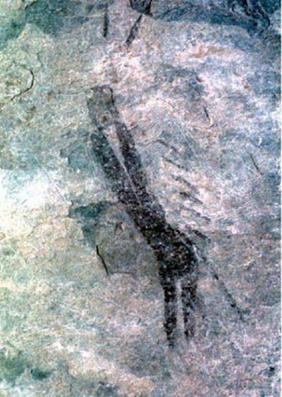 Нет, всё равно не понятно. То есть понятно, что этот «бог» или «дух» является существом более сложного порядка, чем «зайчики», изображающий нечто более абстрактное, а стало быть, религиозно-бытовое восприятие мира находится на очень высокой ступени развития. Оно успело обрасти общими понятиями. Рыжая фигура в центре, слева имеет рога, но и перья никуда не делись – просто переместились на руки. Ещё одно загадочное абстрактное существо. Но простенькая фигурка справа ещё загадочнее. Она имеет некоторое сходство с правой фигурой, но при этом несёт квадратную голову, да ещё и совсем странное устройство на этой самой квадратной голове... Нет, я определённо понимаю «специалистов» по внеземным контактам – так и просится назвать эту штуку антенной. Скрипнув зубами, пытаюсь найти альтернативную версию. Историки предлагают вспомнить часто встречающиеся в этих местах изображения лося. Вот одно из таких изображений на камне: