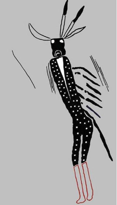 Уже знакомый трёхпалый «зайчик» с уже знакомой фигурой с головным убором из перьев. Но всё же фигурка немного другая – у неё есть ярко выраженный хвост и какие-то штуки на спине. На перья вроде бы не похоже. Так что это такое? Пятна по всему телу, чёрного цвета почему-то, но в сочетании с белыми гольфиками. Никакое животное чётко в этом наряде не читается. Может быть какой-то вымерший вид? Вот это изображение покрупнее: