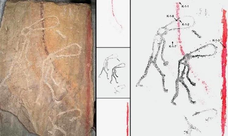 Но это всё достаточно поверхностно. Если же пытаться рассмотреть все эти рисунки повнимательнее, то количество вопросов вырастет ещё больше. Например заметно, что рисунки были нанесены не за один раз и некоторые изображения перекрывают старые. Посмотрите, например, на самое первое изображение. На фото правая фигура нанесена поверх старой чёрного цвета. Между прочим заметно, что старое изображение постарались удалить, но очень небрежно. Но ещё «страннее» то, что голову фигуры справа пытались зачеркнуть. Вообще плита с этим изображением явно сначала находилась совсем в другом месте и все рисунки были уже на неё нанесены задолго до того, как её использовали в качестве детали захоронения. Её даже успели расколоть – часть изображения отсутствует. Однако это ведь не просто кусок камня, а часть погребального обряда, а это означает, что случайным элементам здесь не место. Вот и думай, что это всё значит.
