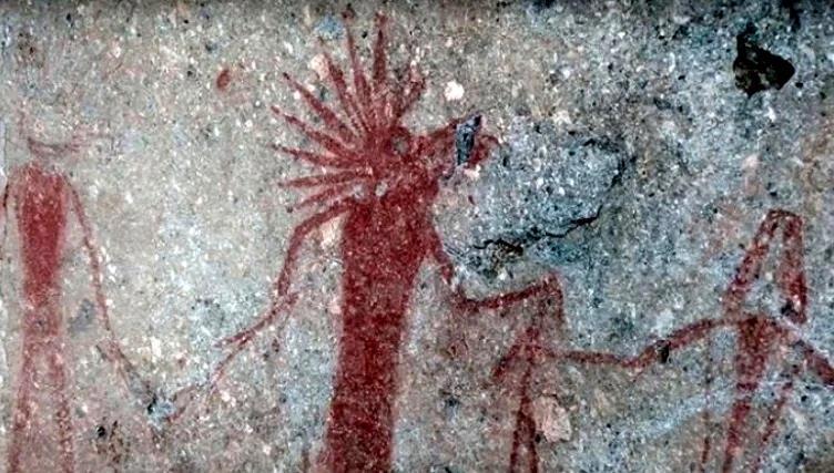Люди с перьями на головах живо напоминают наряды индейцев, но ведь от Алтая до индейцев путь неблизкий, мягко говоря. Общего между ними вообще ничего нет. Они даже к разным расам относятся – усопшие с Алтайской гробницы европеоиды без всяких примесей. Однако перья есть! Разница только в том, что у изображений с Алтая ещё какие-то чёрные штуки в руках похожие на пушистые хвосты чернобурки. Правда тут же находятся изображения трёхпалых людей в масках зайчиков. Прям, как у нас на детских новогодних утренниках. Интересно, когда появилась эта традиция и откуда она пошла? И почему у них только по три пальца? А может быть это вообще не пальцы? Ведь они на рисунках местами очень похожи на перья вообще-то.