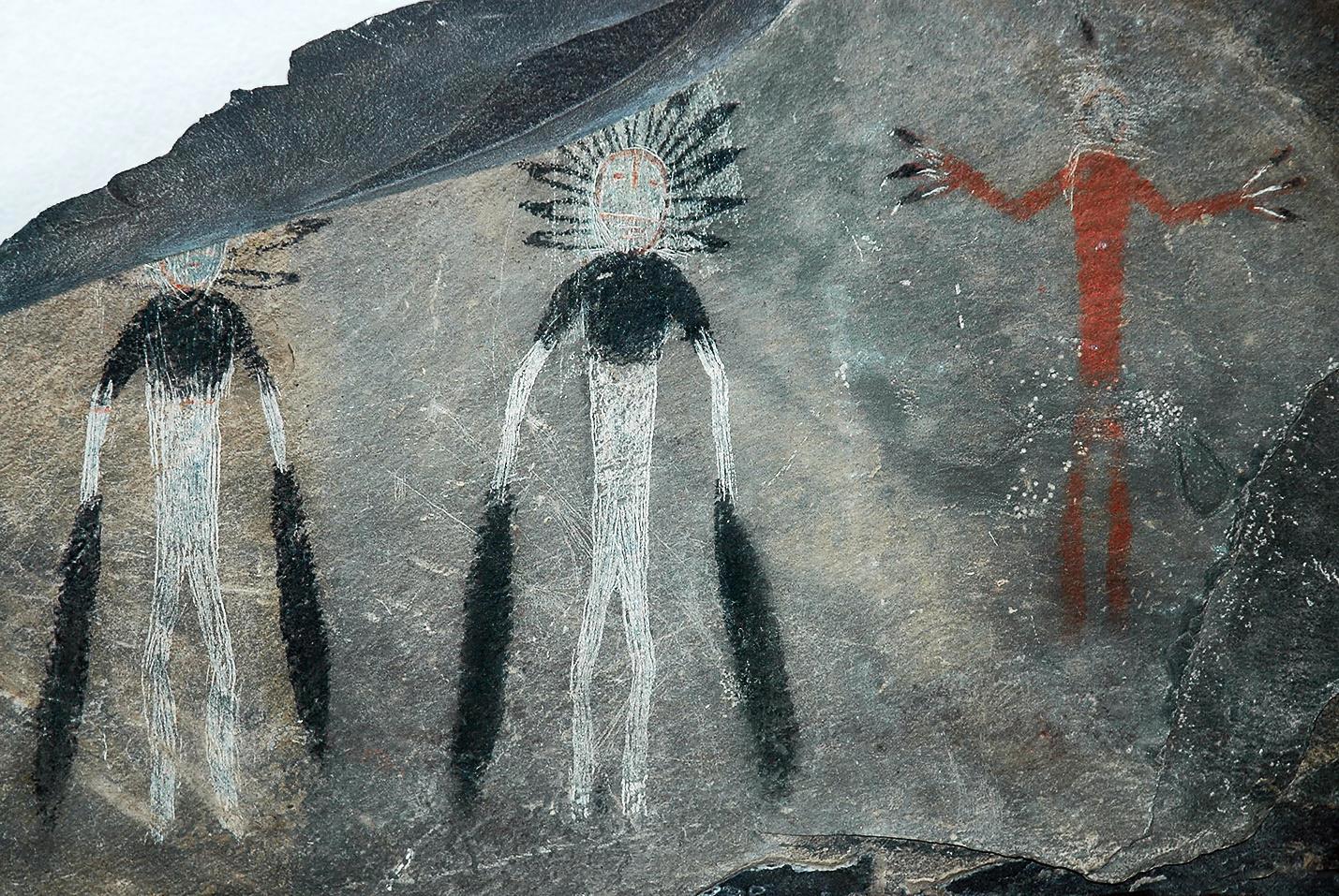 Историки оправдывают «лосиную» версию достаточно просто – вытянутая форма напоминает голову лося, мол. Ну, не знаю... Мне эта шишка на голове лося никак не напоминает, особенно с учётом того, что собственно «голова» у изображения, хоть и квадратная, но тоже имеется. Да и есть среди изображений и рисунки настоящих лосей, и они там легко читаются. Нет. Неправильная у них версия – не лось это никакой. Вообще ничего лосиного тут нет. Ещё раз посмотрите на первое изображение — линия-то двойная. То есть это какая-то петля из ветки на голове. Но всё равно не понятно. Да и вообще у древних с этими головами явно какой-то «пунктик». Посмотрите на этих рыжих: