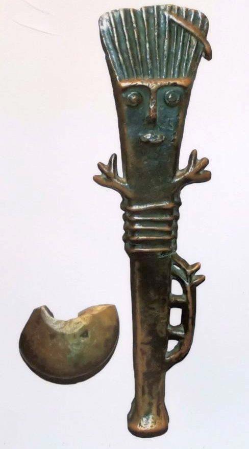 Смотрим. Слева какой-то козёл, справа – птичка, ниже птички видно то самое человекообразное с петлёй на голове (видимо образ очень важный, раз так часто встречается). Но всё же самое необычное – это фигура в центре. Его называют «древовидный идол». Действительно похоже на ветвистое дерево немного. Но лишь немного. И снова – «перекрёстные связи». Вот ещё один «древовидный идол». На этот раз из бронзы: