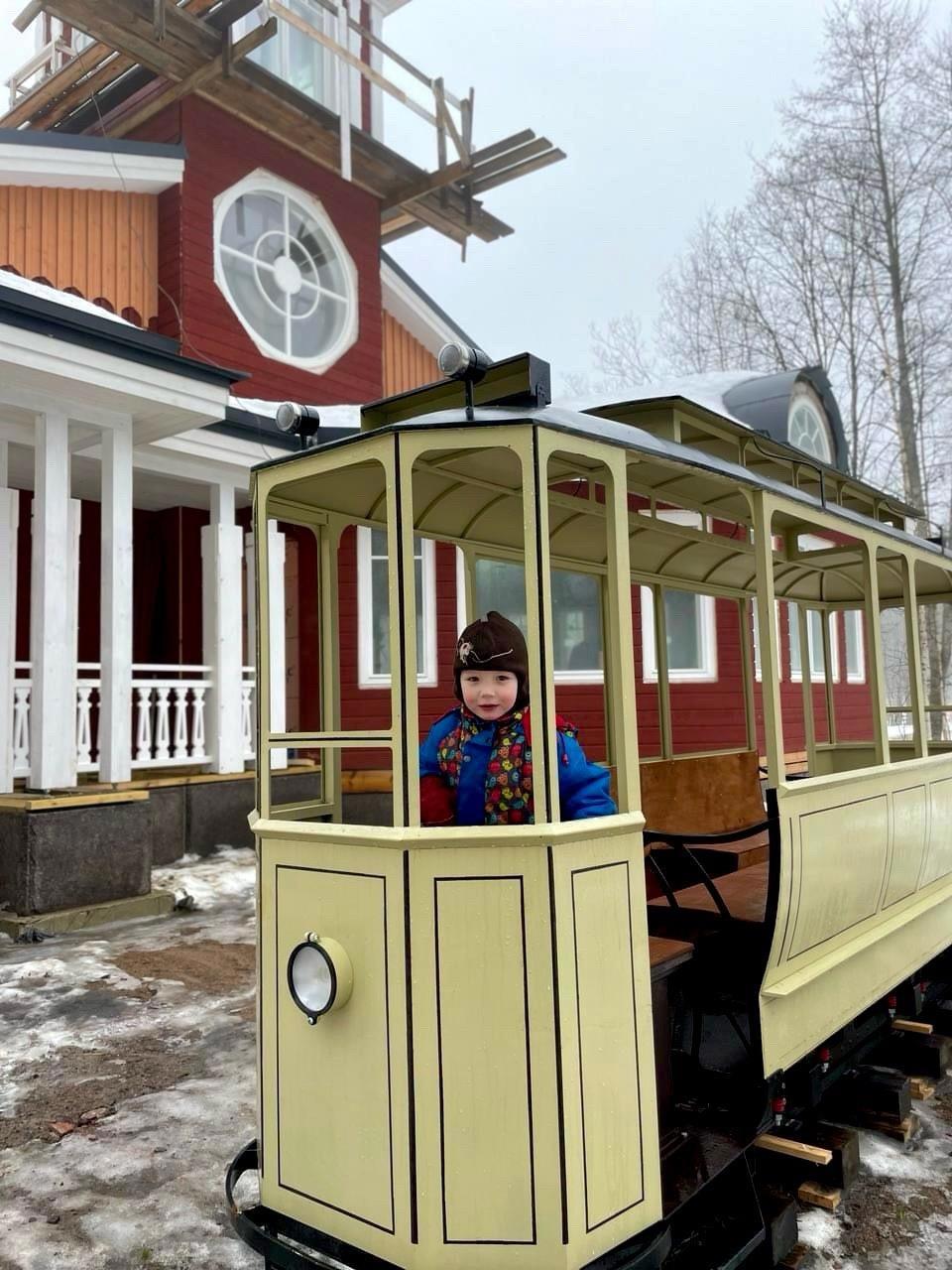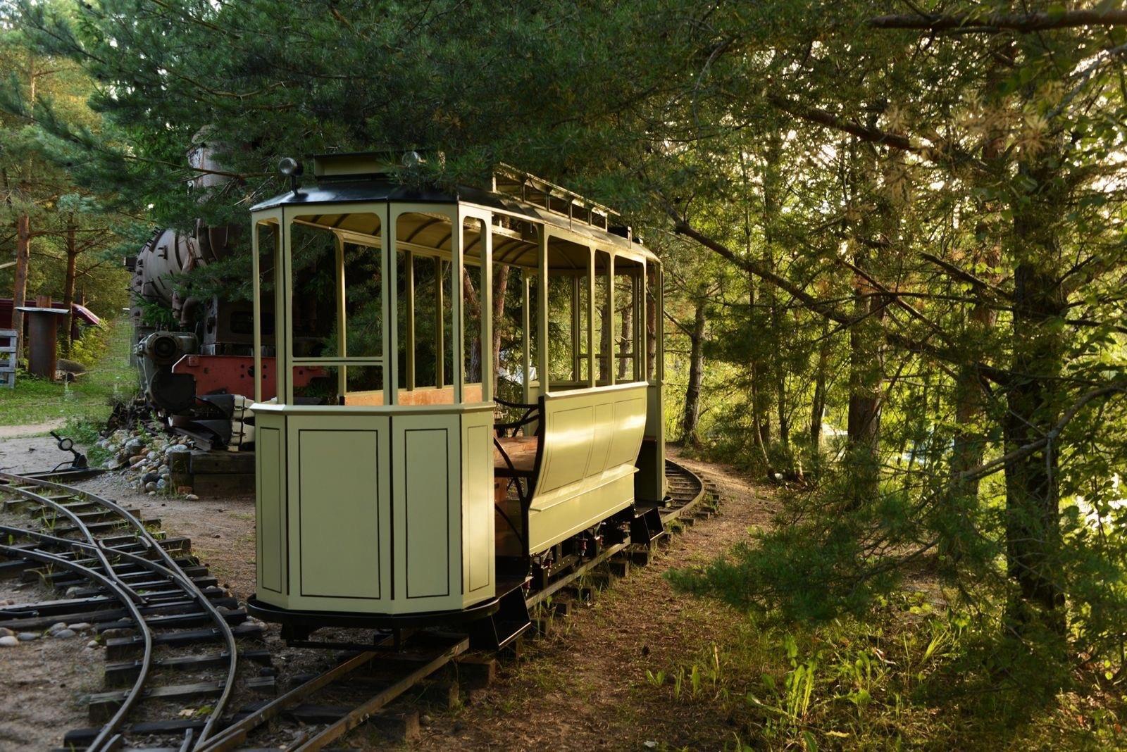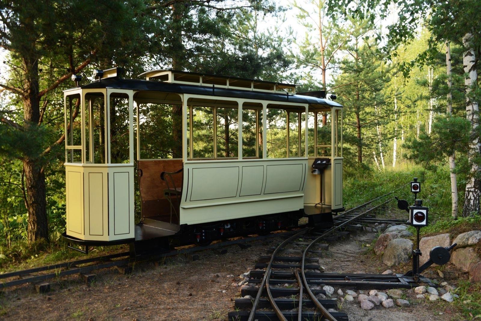 Это точная копия выборгского трамвайчика, созданная талантливым инженером Павлом Чилиным (очень рекомендуем узнать больше об этом мастере).
