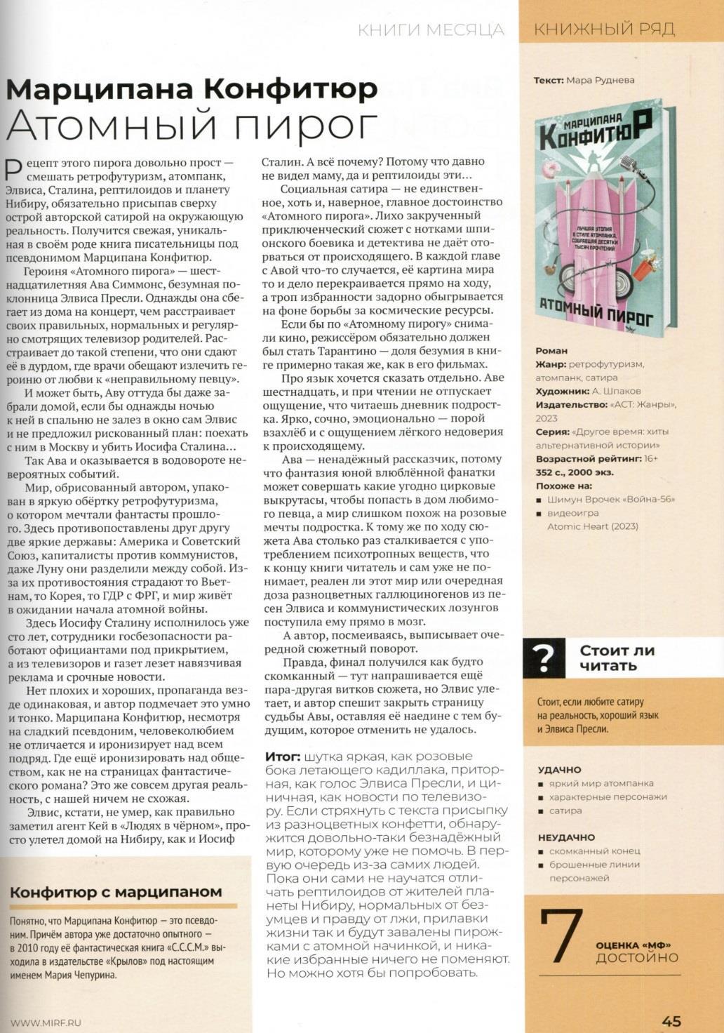 Автор: Марципана КонфитюрСлучайно обнаружила, что в январе в журнале "Мир фантастики" вышла рецензия Марии Рудневой на "Атомный пирог". Хотя там говорится, что сюжетные линии некоторых персонажей оборваны, с чем я не согласна, отзыв хороший и приятный, рецензент всё понял правильно :) Много раз упоминается Элвис Пресли, что хорошо :) Особенно мне понравилось, что "ярко как розовый Кадиллак, сладко как голос Элвиса и цинично как новости по телевизору". Ага, так и было задумано :) При этом я сама-то несколько месяцев назад написала весьма отрицательную рецензию на книгу Марии -- но либо она ее не видела, либо слишком благородна, чтобы сводить личные счёты.