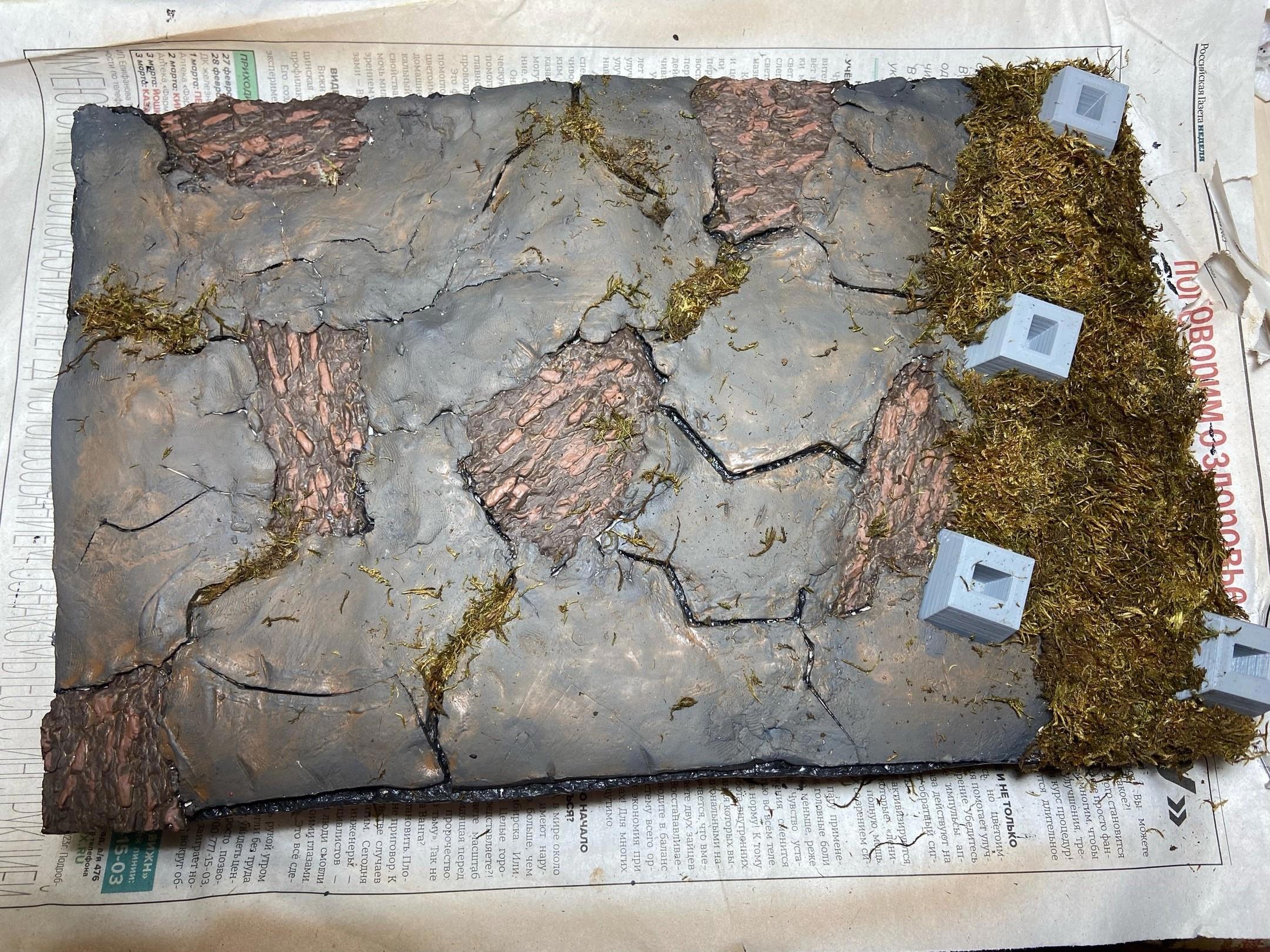 В общем, подставка под диораму "Встреча Патрулём топливной колонны" почти готова. Покрашено, затонировано, надута пыль и грязь, высажена трава :)