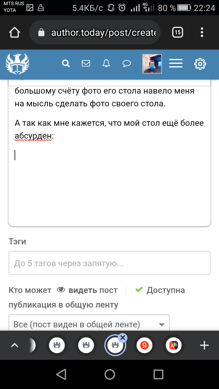 P.S. если кто-то не понял фото моего стола, поясню, это скриншот с экрана телефона, так как 90% времени я пишу свои произведения через него... И даже на сайт захожу просто через браузер, без спец приложения.