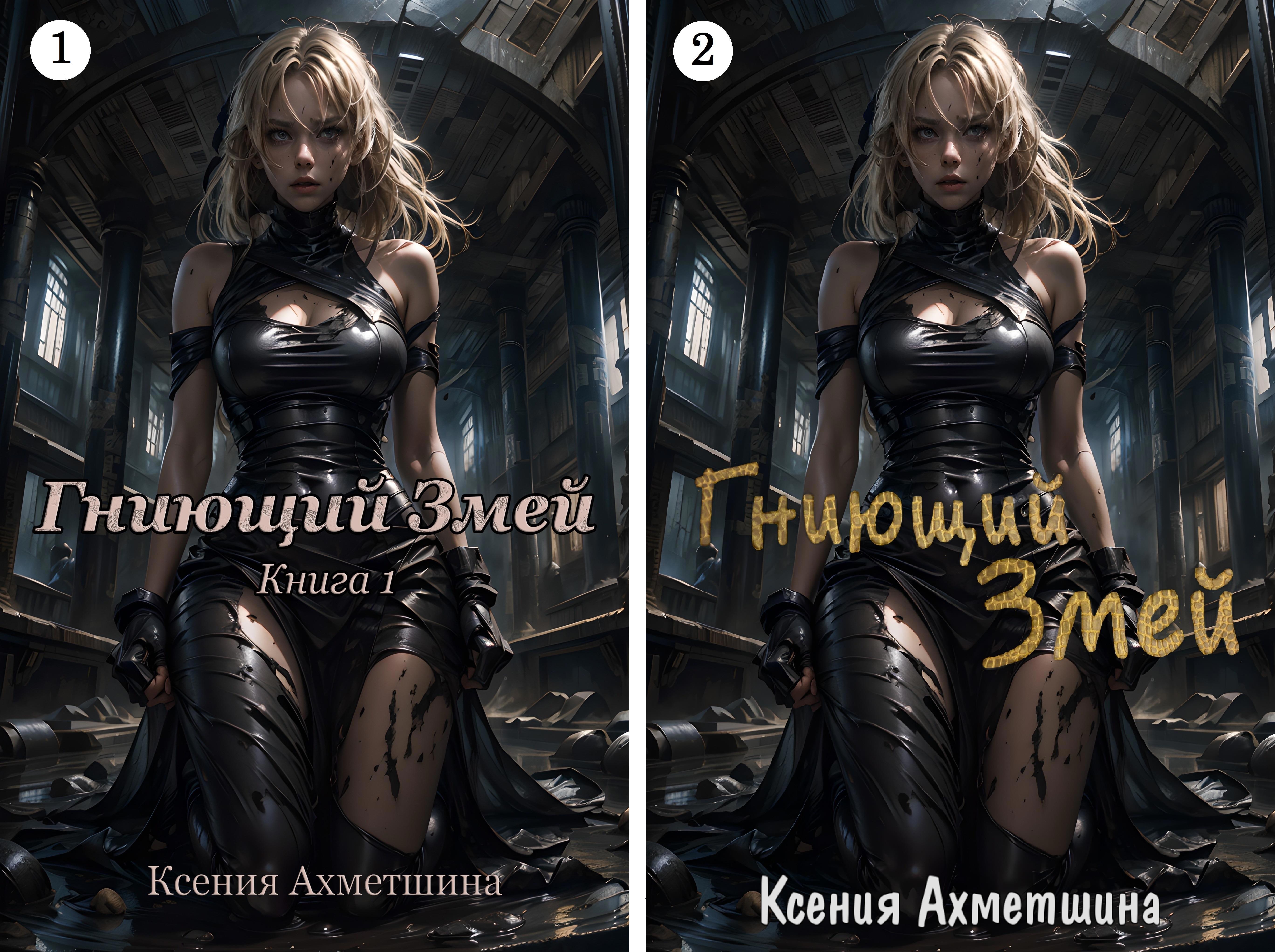 Первый вариант выглядит достаточно стильно, но простоват, хочется чего-то эдакого. Попробовала написать название чешуёй, хотя на маленькой картинке текст выглядит просто жёлтым. Оба варианта читабельны при уменьшении, второй даже больше.
