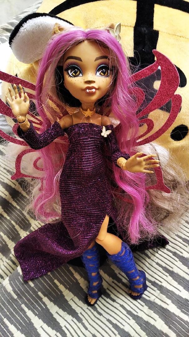 Я перешила ей платье, сделав его тем самым еще больше волшебным, а также оформила прическу. Образ еще не до конца завершен, ибо некоторые детали из Китая еще не приехали, но большая часть доделана. ПО спойлером ее текущий внешний вид (крылья только еще не закреплены, поэтому косые
