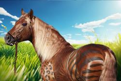 Своё название хоррги получили, видимо, за то, что издавали характерный гортанный звук, когда злились или были чем-то недовольны. Животные отличались, на мой взгляд, весьма экзотичной мастью – этакая помесь полосок зебры и пятен леопарда на общем гнедом фоне разного оттенка. Выглядело очень красиво и опасно из-за слегка выступавших из-под губ клыков и рога во лбу, который обычно спиливали. У жеребцов он вырастал примерно до семидесяти сантиметров, у кобыл – не более десяти.